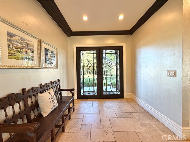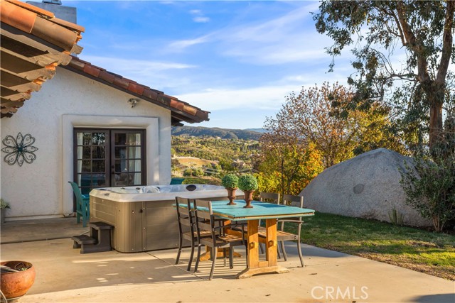 **Rocky Ridge Estate: Your Wine Country Home on Temecula's De Portola Wine Trail** Discover the ultimate Temecula wine country lifestyle at Rocky Ridge Estate, a stunning Spanish Hacienda on 2.8 fully fenced acres along the prestigious De Portola Wine Trail. This gated estate combines luxury living, documented income, and endless possibilities minutes from town yet peacefully secluded. Enter through mission-inspired gates and follow the olive tree-lined circular driveway to this exceptional 3,800 square foot main residence featuring 4 bedrooms, 3 updated bathrooms, and an 864 square foot three-car garage. The open-concept floor plan showcases a living room with exposed beams and wood-burning fireplace, plus a gourmet chef's kitchen with Sub-Zero refrigerator, Bosch appliances, oversized island, peninsula dining, and butler's pantry. Upstairs, the expansive 1,100 square foot primary suite features a fireplace, boutique-inspired walk-in closet, and covered loggia with breathtaking mountain and vineyard views. The spa-inspired ensuite offers dual vanities, soaking tub, and steam shower with triple shower heads. The main level includes a flex room with Murphy bed, remodeled bathroom, drop zone, and laundry room. Two additional bedrooms feature walk-in closets and share a restored bathroom. The detached 1-bedroom, 1-bathroom Casita has documented short-term rental history, perfect for guests or income. The rare 1,500 square foot steel outbuilding features a one-of-a-kind rock climbing wall, ideal for gym, hobbies, art studio, or wine production. Green energy features include a paid-for 17kW solar system and Tesla charging station. Forty-five mature olive trees line the driveway for artisan olive oil production. The pesticide-free orchard includes lemon, pomegranate, guava, apple, and pomelo trees, plus a dog run, chicken coop, and gated perimeter. With no HOA and 350 feet of De Portola frontage, plant vineyards, keep horses, or enjoy resort-style living minutes from Temecula's award-winning wineries. This rare combination of luxury, income potential, and privacy makes Rocky Ridge Estate a lifestyle investment in Southern California's most sought-after wine country destination.