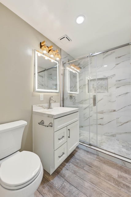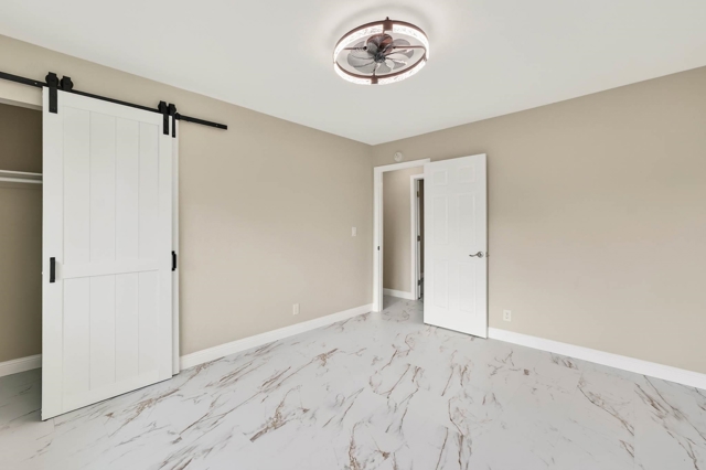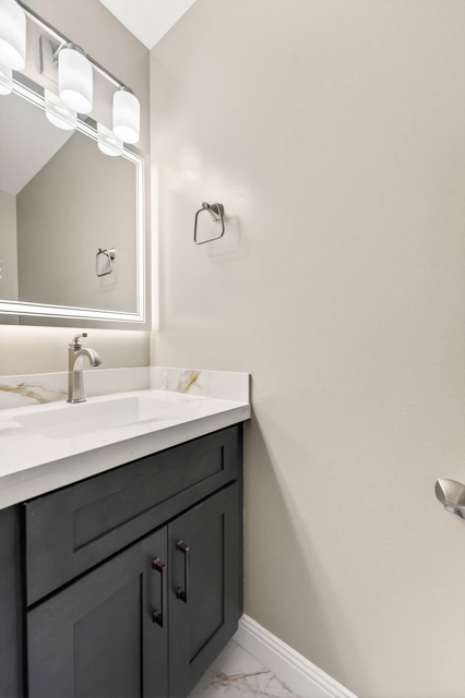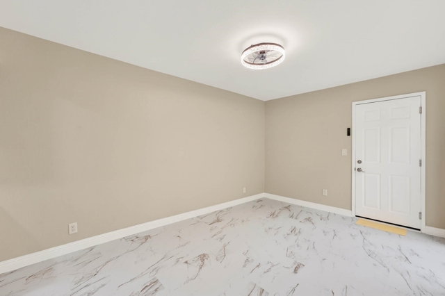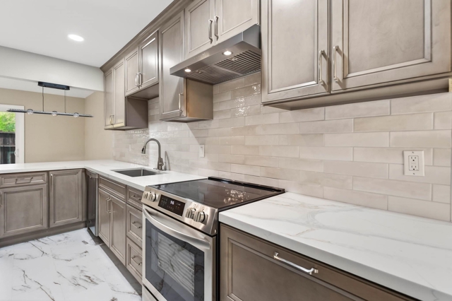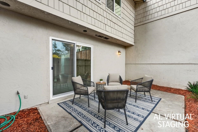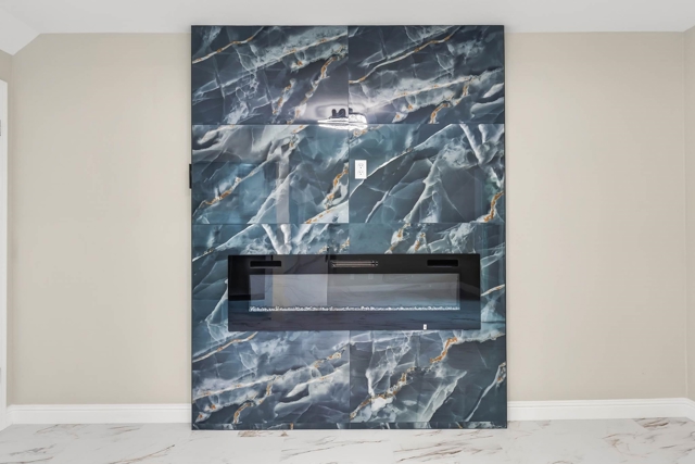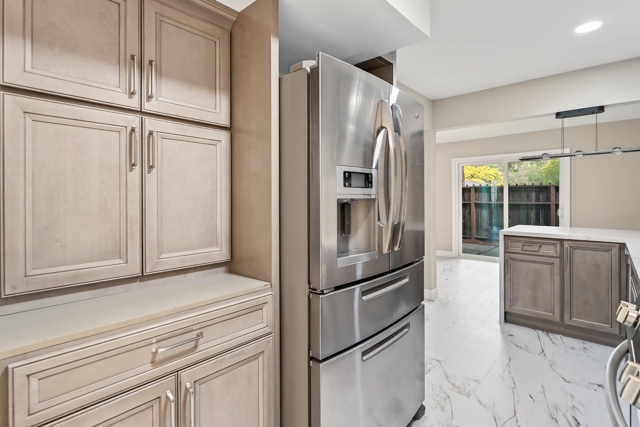Experience the pinnacle of modern luxury in this fully transformed 1,263-square-foot townhome built in 1971. This 2-bedroom, 2-bathroom residence has been masterfully redesigned with a focus on high-end aesthetics, featuring expansive white marble-style flooring with dramatic gold veining that flows throughout the open floor plan. The designer kitchen is a showpiece of contemporary style, boasting quartz countertops with a waterfall edge, premium stainless steel appliances, and a textured subway tile backsplash. In the living area, a striking floor-to-ceiling black marble fireplace serves as a bold focal point. The primary suite offers a sophisticated retreat, complete with a trendy sliding barn door for the closet and a luxurious bathroom featuring an oversized walk-in shower with designer tile surrounds. Large sliding glass doors lead to a private, fenced rear patio, perfect for secluded outdoor relaxation. This home is further enhanced by a two-car garage and sits in a peaceful community characterized by mature pine trees and well-kept grounds. Every inch of this property has been reimagined to offer an upscale, turn-key lifestyle for the most discerning buyer.