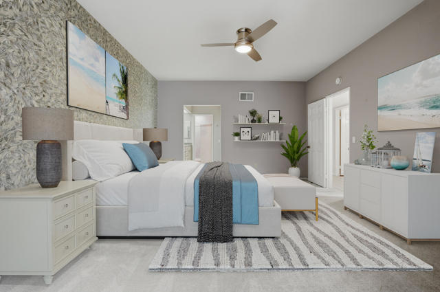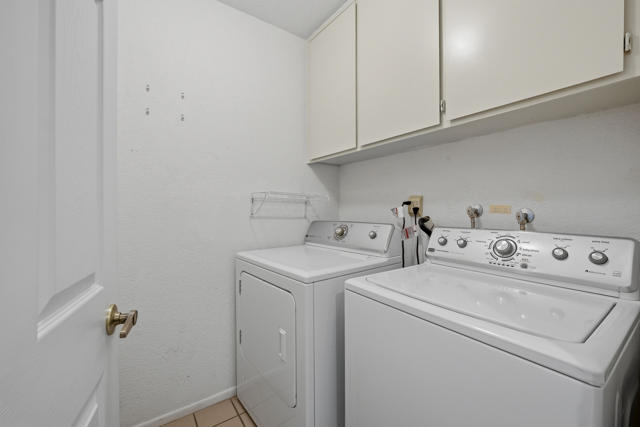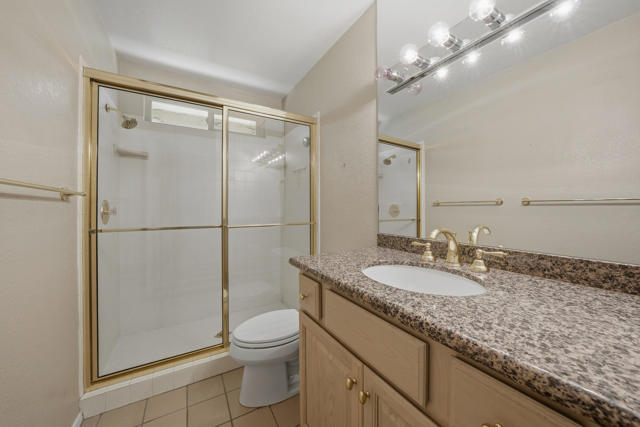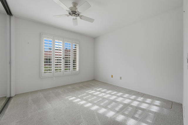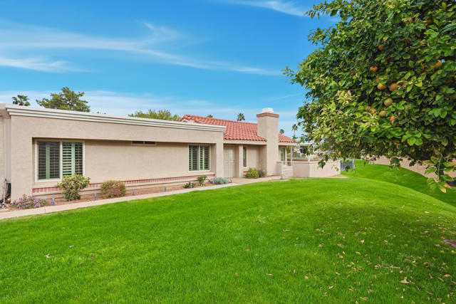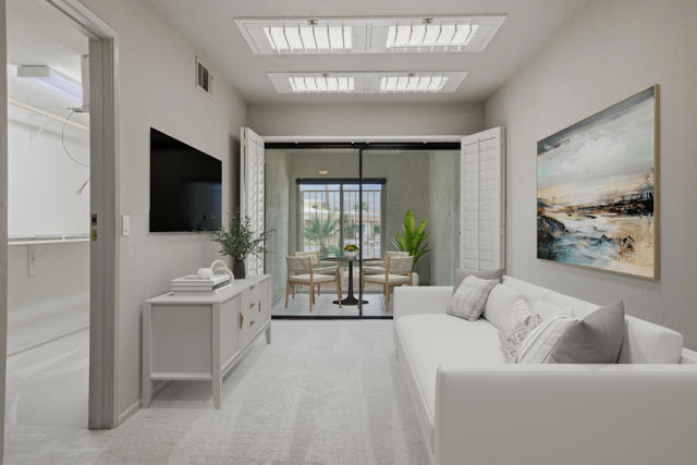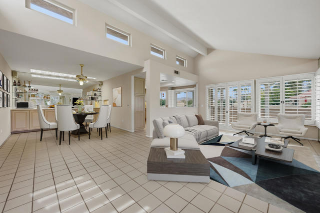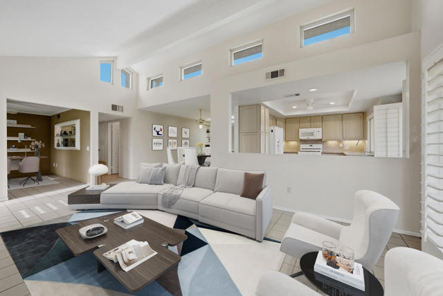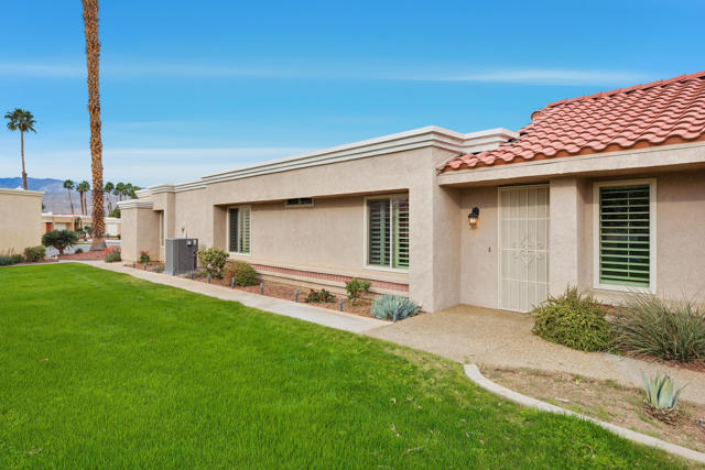 Located in the desirable Casablanca community which boasts 4 pools and spas; tennis and pickleball courts, right in the heart of the Coachella Valley and near Palm Desert's entertainment district, this spacious two-bedroom condo with a den offers comfort, style, and beautiful desert surroundings. The open greatroom features a tile trimmed fireplace, vaulted ceilings, transom windows, and abundant natural light, with peaceful views of the mountains, greenbelt, and tennis courts. A wraparound aggregate concrete patio with a lattice cover creates the perfect space for relaxing or entertaining outdoors. All windows replaced in 2018. Inside, tile flooring runs throughout the home (bedrooms excluded), complemented by shutters for a clean, classic look. The dining area includes a convenient wet bar with fridge, while the kitchen is thoughtfully upgraded with raised-panel cabinetry, pull-out shelves, granite counters with bullnose edges, and a picture window overlooking the lush greenbelt and courts. A versatile den/office sits just off the great room. The expanded primary suite is a true retreat with a sitting area, enclosed patio, oversized walk-in closet, and a spa-like bath with dual sinks, upgraded fixtures, and a beautifully tiled walk-in shower. The guest bath features a tiled stall shower and granite vanity, and the guest bedroom includes mirrored wardrobe doors. The indoor laundry room offers built-in storage for everyday convenience. An oversized one-car plus golf cart garage with built-in storage completes the package. Major systems are already updated, including a newer water heater (2020) and Lennox A/C (2024). Move-in ready and ideally located -- this is easy desert living at its best.