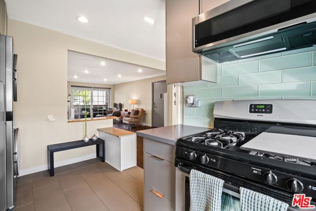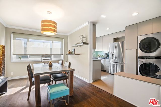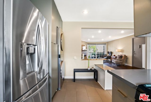 Metropolitan Urban Chic Oasis in Santa Monica! Exclusive controlled-access 14-unit courtyard enclave with lush landscaping. This top floor retreat with serene greenery views. Rich textured engineered wood floors across the entire unit with an expansive living room anchored by a classic brick gas fireplace. There is a seamless transition to the outdoors through elegant French doors to redone full balcony. Architectural depth is defined by elegant crown moldings and recessed lights in all rooms. Substantial full dining room that's capable of housing a full scale table, New grey wood sleek kitchen cabinetry and stainless steel appliances with quartz countertops with beautiful glass tile backsplashes and full granite sink. In-unit full size gas laundry provides ultimate in-home convenience and an updated dual- pane Milgard windows to optimize thermal insulation. Generously sized bedroom scaled to accommodate a dedicated workspace, Redone walk-in shower room with integrated bench seating and double vanity. Secured gated parking with storage and Low homeowners dues.Premier location that balances residential tranquility w/immediate urban access. Perfectly positioned near World-Class Medical hubs St. John's and UCLA. Short distance to UCLA campus and public transportation and Close to Bristol Farms, Whole Foods, Trader Joes and Erewhon