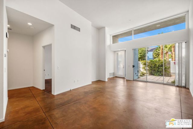 Modern desert living at its best in Palermo Palm Springs. This sleek and sophisticated single-level home impresses from the start with its private entry and two inviting courtyard patios perfectly framed by dramatic mountain views. Inside, stained concrete floors, soaring ceilings, and clerestory windows create a bright and open atmosphere that defines the Palm Springs lifestyle. The stylish kitchen flows easily to the living and dining areas, ideal for entertaining or quiet weekends away. The bedroom retreat features a large walk-in closet and direct access to the patio, while the spa-inspired bath offers a walk-in shower and modern finishes. Updates since 2024 include a new water heater, dishwasher, microwave, washer, dryer, ceiling fan, and fresh interior paint. Located within a gated community, this residence is just steps from one of the pools and spas and enjoys one of the best positions in Palermo with unobstructed west-facing mountain views. Residents enjoy resort-style amenities including a clubhouse, fitness center, two pools, and two spas. Fee Land (you own it) and just minutes from downtown Palm Springs make this the perfect full-time home, weekend escape, or investment opportunity. Take the Matterport Virtual Tour for a better sense of flow.