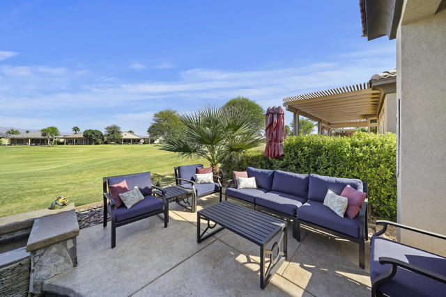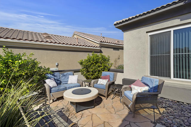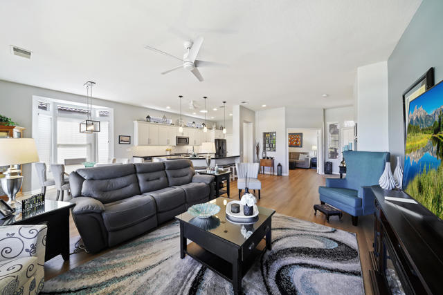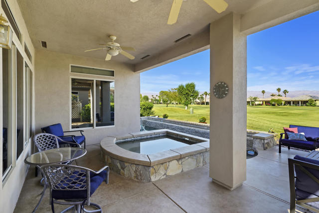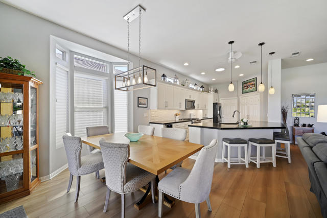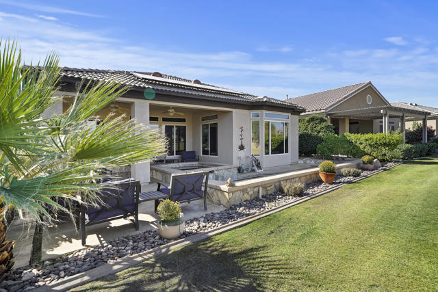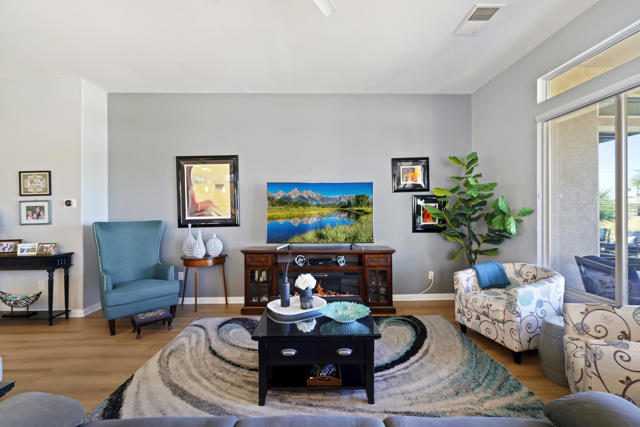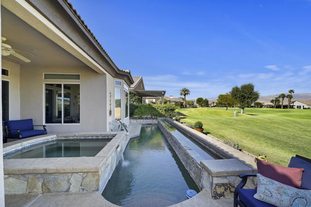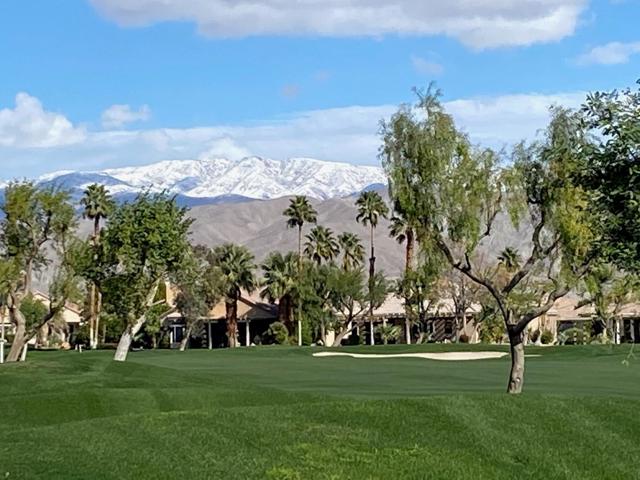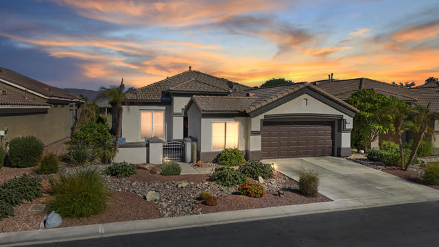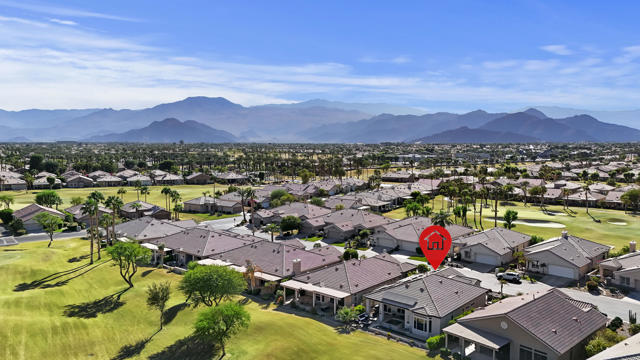 Greet the morning sun in this lovely, remodeled home with expansive 4th fairway and mountain views. The perennial-favorite Merion model resides on a quietcul-de-sac and offers great-room living with 1700 square feet, two bedrooms, den, laundry room with storage and 2-car plus golf-cart garage. The gourmet kitchen has been reimagined with spacious quartz counters, reduced-height island that invites guest interaction, pantry, wine fridge, hidden-appliance cabinetry, and copious storage space. There is brand new LVP flooring throughout the entire house, two renovated bathrooms, walk-in closet, plus solar panels to mitigate energy bills. Enclosed front patio doubles the outdoor living areas and complements the covered backyard space with its heated Pebble-Tec pool/spa.