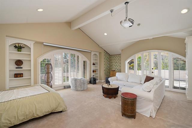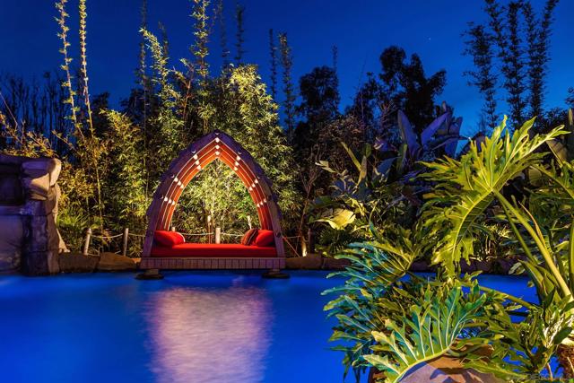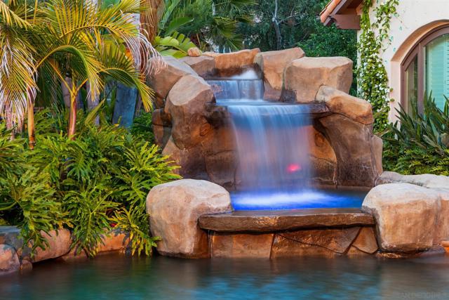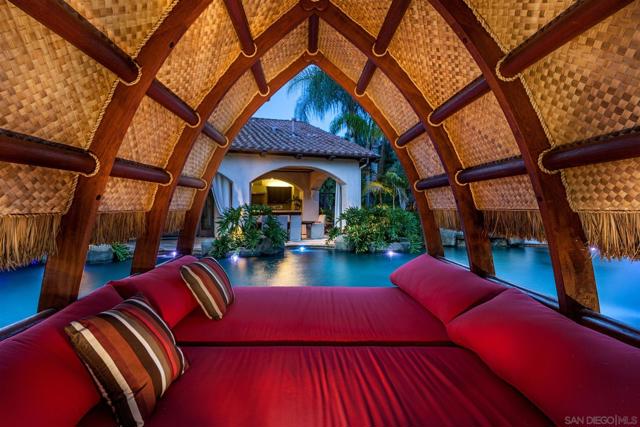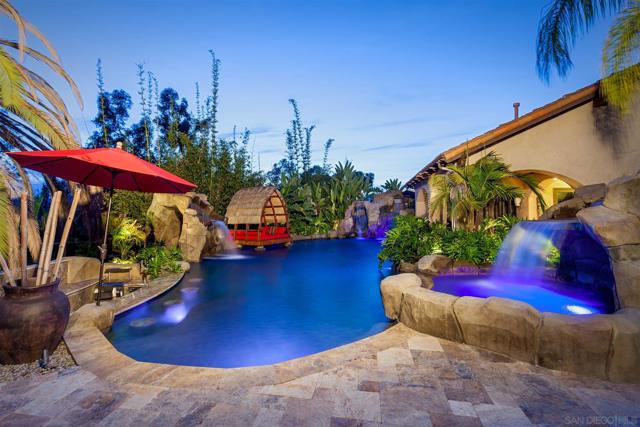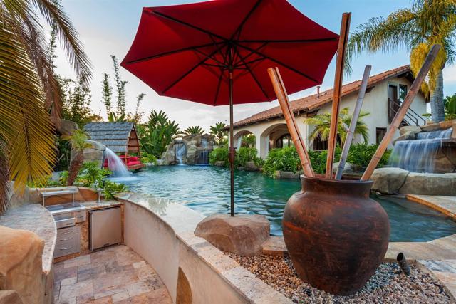 Barefoot luxury! Award-winning pool & BBQ area. This home is fun & has so much to offer. Light & bright with very high ceilings. Lives like a single-level w/Master, 3 BRs & executive office on the main level plus 1 BR & add. office upstairs. Huge rooms. Pool details include: Swim up bar, huge palapa, Balinese Lumbung, 4 waterfalls, water slide, Jacuzzi, outdoor kitchen, EVO BBQ grill. Separate pool room w/fully equipped gym. Sport court, infrared sauna, vegetable planting area, fruit trees. On nearly 2 acres.