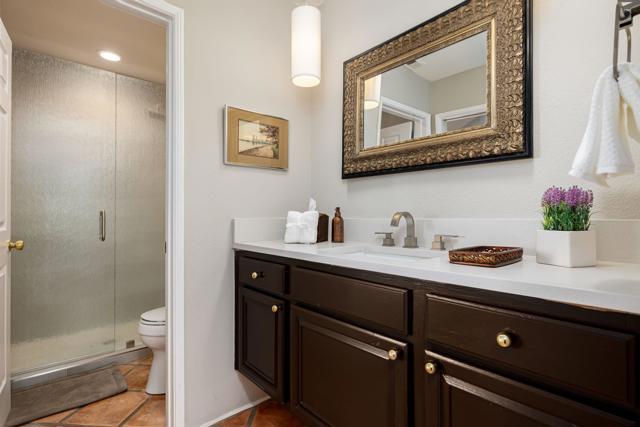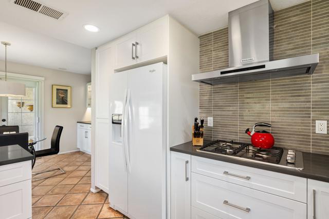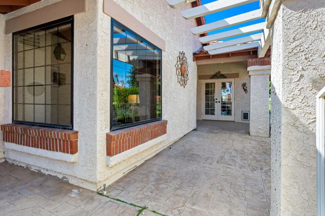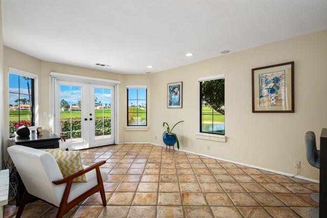 One-of-a-kind opportunity on highly desirable Avellino Circle in guard-gated Desert Falls Country Club, featuring breathtaking 180 views over shimmering water, multiple golf course fairways, and dramatic mountain backdrops. This single-level condo offers 2 bedrooms and 2 baths and has been updated for effortless desert living and entertaining.The remodeled kitchen with an eat-in nook is designed to gather--featuring a gas cooktop, gray quartz countertops, white cabinetry, beverage fridge, and a peninsula with bar-height dining for casual meals and hosting. Both bathrooms have been beautifully remodeled with floor-to-ceiling tiled showers, quartz countertops, and newer cabinetry; the primary bath includes a walk-in shower.Outdoor spaces are equally inviting: a gated, tiled front courtyard wraps around to an expanded back patio, creating multiple places to relax and enjoy the scenery. French doors from both the living area and family room enhance the indoor-outdoor flow and bring the views front and center.A rare view setting in one of Palm Desert's most sought-after communities--minutes to El Paseo's renowned dining and shopping, and Acrisure Arena. Located mid-valley close to fine dining, groceries, and retail. Desert Falls Country Club is privately owned and offers pay-as-you-play and membership options. Don't miss this special home.