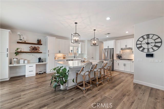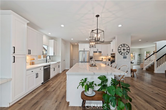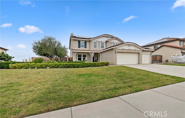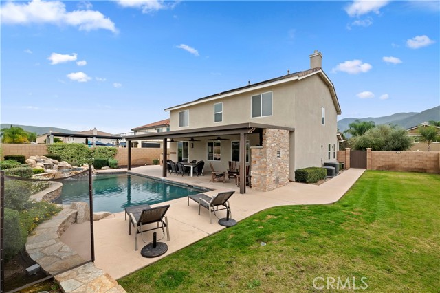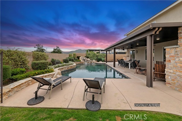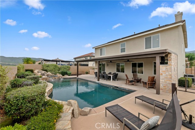 Welcome to this stunning pool home in Painted Hills, South Corona, offering the perfect blend of comfort and style. Situated on an expansive 10,000 Sq/Ft. lot, this spacious residence features five bedrooms and two-and-a-half bathrooms with room for everyone to enjoy. As you enter, you’re greeted by a formal living room and dining room, leading into a warm and inviting family room that seamlessly opens to the recently remodeled kitchen. Designed with both beauty and practicality in mind, the kitchen showcases quartz countertops, stainless steel appliances, a cooktop stove, built-in desk, farmhouse sink, refrigerator, spice drawer, soft-close drawers, lazy Susan, designer pendant lighting, under-cabinet accent lighting, and crisp white Shaker cabinetry. Upstairs, you’ll find all five bedrooms and two full bathrooms. The primary suite offers a generous walk-in closet and a spa-inspired bath featuring a step-in shower—your own private retreat. The backyard is truly a showstopper—an entertainer’s dream complete with a gorgeous swimming pool and spa, waterfall, reef step, and beautiful PebbleTec finish. Enjoy outdoor living year-round under the full-length Alumawood patio cover, ceiling fans, highlighted by a stunning stone fireplace with a widescreen TV, stamped concrete hardscape and mountain views. Additional upgrades include solar, 7-inch baseboards, remote-control window blinds, luxury vinyl plank flooring throughout, a tankless water heater, Nest thermostat, ceiling fans in all rooms, and a three-car garage. Ideally located close to shopping, restaurants, parks, and movie theaters, this exceptional home offers the perfect combination of luxury and convenience.