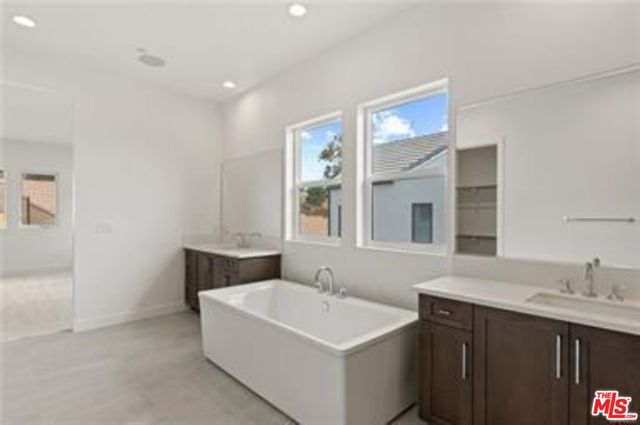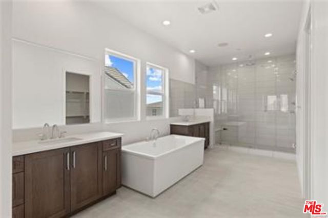 Brand new construction in the prestigious Verona Estates community of Chatsworth, nestled in the foothills of Porter Ranch. The spacious living area features a sleek linear fireplace and is flooded with natural light during the day, while recessed lighting provides an ambient glow in the evenings. The bright and spacious living room features sliding glass doors that open to the backyard, creating seamless indoor-outdoor. The chef's kitchen is a true showstopper, boasting an oversized quartz island, Sub-Zero refrigerator, Wolf appliances, walk-in pantry and custom soft-close cabinetry, perfect for hosting and gatherings in style. The main-level primary suite is a private retreat, complete with dual sinks, a luxurious soaking tub, and a generously sized walk-in closet. The upstairs primary suite offers breathtaking views, along with a spa-inspired bathroom featuring a spacious walk-in shower with dual shower heads, double sinks, a separate soaking tub, and a generously built-out walk-in closet. All bedrooms are en-suite, offering ultimate privacy and comfort for every member of the household. The home features two spacious lofts, ideal for a private office, media room, or additional living space, Additional highlights include a fully paid-off solar system, Energy Star-rated efficiency, dual-pane windows. This stunning home offers a beautifully landscaped backyard featuring pavers, artificial turf, and new gates, providing a private and functional space ideal for entertaining. Ideally situated near the new Porter Ranch Vineyards shopping center, upscale dining, and a newly developed community park. This exceptional home combines modern elegance, premium finishes, and an unbeatable location.