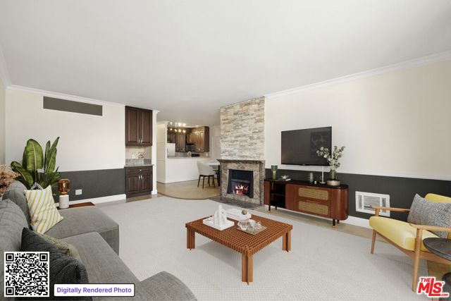 TOP FLOOR 1 BEDROOM + DEN ideally located in the heart of Brentwood, just moments from the best coffee shops, restaurants, and boutiques. Quietly positioned at the rear of the building, this light-filled unit enjoys excellent natural sunlight and peaceful treetop views. The spacious living room features a striking stacked-stone fireplace and opens to a private balcony, creating a warm and inviting atmosphere. A separate dining area flows seamlessly into the kitchen, complete with granite countertops, stainless steel appliances, and a breakfast bar perfect for everyday living. The generous primary bedroom offers ample closet space with dual closets, while the versatile den is ideal for a home office, guest space, or nursery. The bathroom includes dual glass vessel sinks, granite counters, and abundant storage. Enjoy the best of Brentwood living in this quiet, sun-drenched top-floor residence just steps from premier dining and shopping.