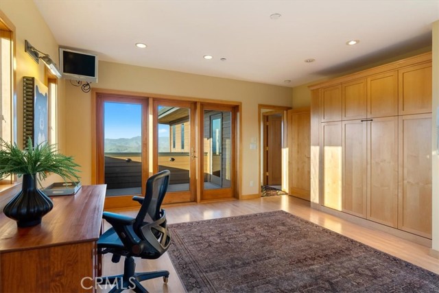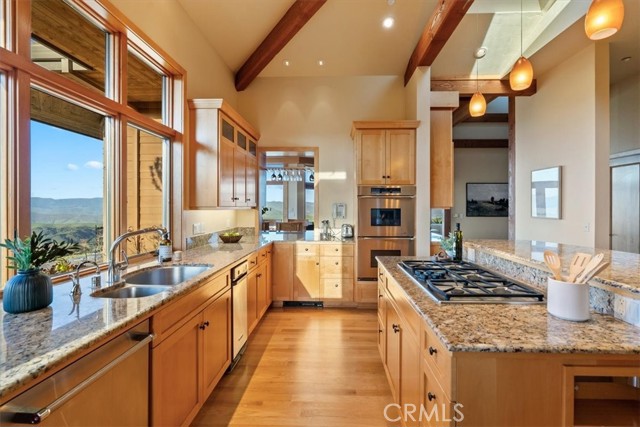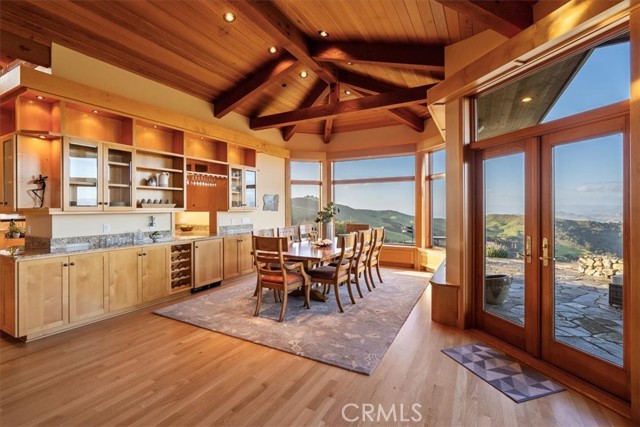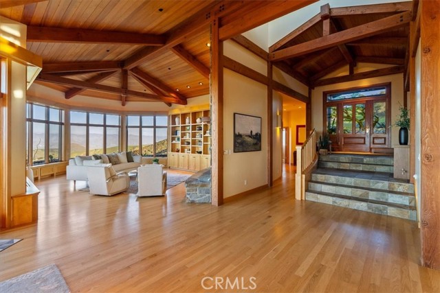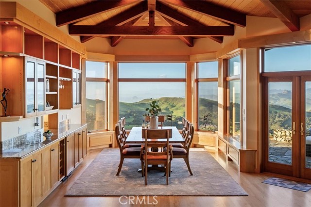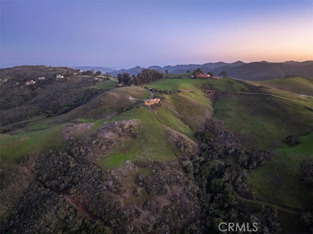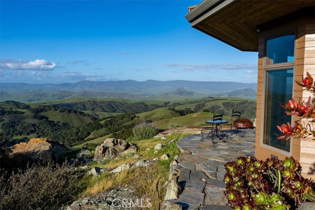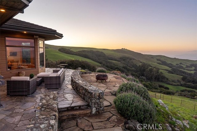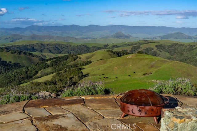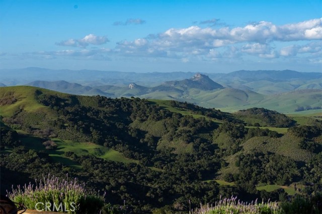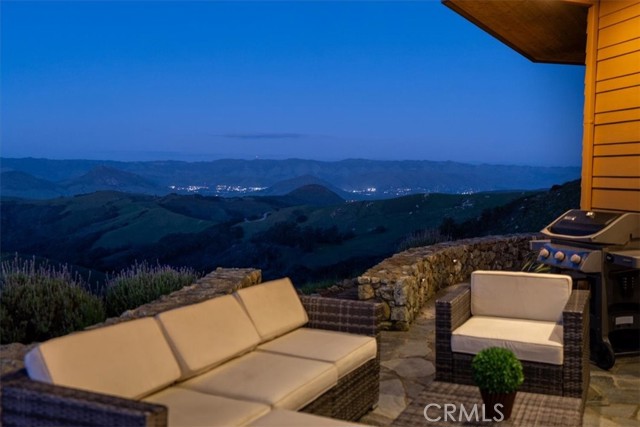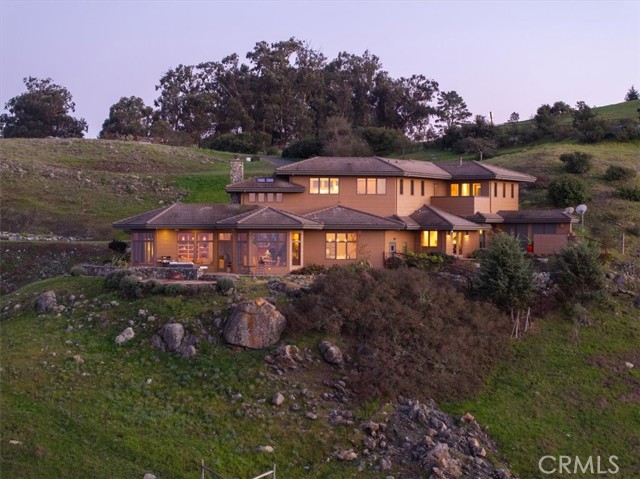 Set high above the landscape in Prefumo Canyon, this extraordinary 56± acre private estate offers commanding, unobstructed views of the Pacific Ocean, Morro Rock, the Seven Sisters, Irish Hills, and the city lights of San Luis Obispo—one of the Central Coast’s most iconic vantage points. Despite its peaceful seclusion, the property is located approximately 5.5 miles from downtown San Luis Obispo, about 20 minutes to Avila Beach, and within easy reach of Morro Bay, Montaña de Oro State Park, wineries, shopping, schools, and the regional airport. The custom-built main residence (2004) is thoughtfully designed to embrace its setting, featuring vaulted tongue-and-groove cedar ceilings, walls of glass, skylights, and seamless indoor-outdoor flow. The flexible floor plan includes four bedrooms, three bathrooms, a media room, office, and bonus room or optional fifth bedroom, all arranged to maximize privacy and views. The great room is anchored by a sculptural serpentine stone wall built from on-site stone, a gas fireplace, wraparound windows, and French doors opening to panoramic patios. The kitchen and dining areas offer vaulted beam ceilings, a generous center island, expansive picture windows, and direct access to outdoor entertaining spaces. The main-level primary suite, privately positioned in its own wing, features exposed beam ceilings, patio access, and a spa-inspired bath with a travertine steam shower and soaking tub oriented toward the horizon. A detached cabin, fully separated from the main residence, provides a full kitchen, bedroom, bathroom, living and dining areas, laundry, and dedicated storage/workshop space—ideal for guests, extended stays, or multigenerational living. The land invites exploration with private hiking, abundant wildlife, and ever-changing natural scenery. The property is extensively engineered for comfort and resilience, offering multiple water sources, filtration and storage systems, owned solar with battery backup, a propane-powered generator, fire-resistant construction, and infrastructure designed for reliable year-round living.