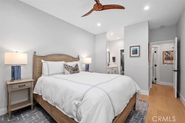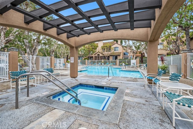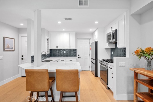 Prime Location! Recently completed top-to-bottom renovation! Fully furnished, turn-key, ground-floor, single-level located in a quiet, community walking distance to fine dining and two shopping centers, coastal close with a refreshing ocean breeze. Community pool and spa. This open-concept home features newly replaced hardwood floors, updated interior/exterior doors and beautiful custom windows, recessed lighting throughout, and a two-way gas fireplace with bi-fold glass doors. Modern kitchen includes quartz countertops, custom cabinetry, bar seating, and recently updated appliances: 6-burner range, dishwasher, disposal, microwave, refrigerator, and interior stacked washer/dryer. Spacious primary suite offers a professionally designed custom closet. Bathroom features dual sinks plus a separate privacy room with vanity and step-in shower. Additional highlights include updated heating and central air systems, remote-controlled bedroom ceiling fan, and top-down/bottom-up remote shades in dining area with additional shutters, shades, and draperies throughout. Covered patio with room for BBQ and outdoor dining—enjoy morning sun without harsh afternoon exposure. Attached garage with epoxy flooring and EV charger. Move-in ready and thoughtfully upgraded throughout!