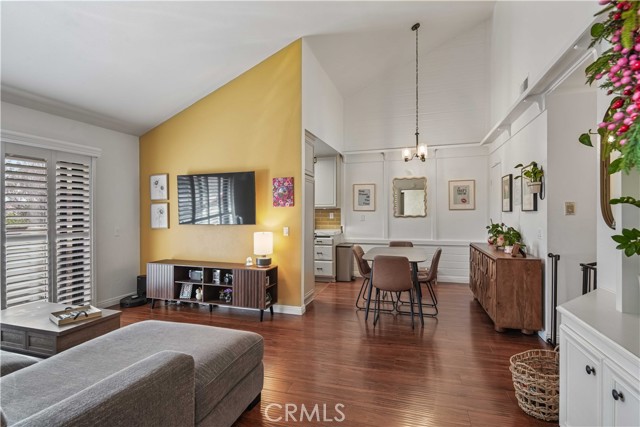 Welcome to this move-in ready top level condo, beautifully remodeled from top to bottom and ideally located overlooking the community pool and greenbelt. A mature magnolia tree adds privacy from the balcony while still allowing open views. The living room features high ceilings and a full custom built-in with open display shelving above and enclosed cabinet storage below, creating a true focal point. The dining area is finished with custom wall trim and flows into the updated kitchen with stainless steel appliances, freshly painted cabinetry, and porcelain countertops. The remodeled guest bath includes in-unit laundry for added convenience. The primary bedroom offers a walk-in closet and an updated en-suite bathroom. A 2 car tandem garage is attached to the building for easy access. The community includes 5 pools, multiple playgrounds, and HOA dues cover water and trash.