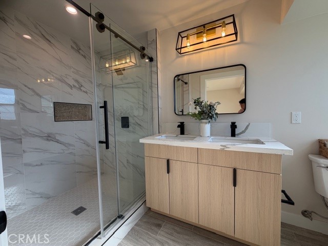 Nestled in the highly desirable South Shores neighborhood, this newly remodeled home has breathtaking ocean and Catalina Island views! Enjoying a coastal setting and gentle ocean breeze, this home is just minutes from the cliffs of Rancho Palos Verdes and Trump National Golf Club. Enjoy easy access to Cabrillo Beach, coastal trails and Downtown San Pedro and the new Waterfront at the Port of LA. The home offers 3 bedrooms, 3 1/4 bathrooms. Each bedroom has it's own private bathroom! Upstairs is a large living room with cathedral beamed ceilings and a gas-burning fireplace, dining area, kitchen, laundry area, powder room and the primary en-suite. Two large sliding glass doors lead you out to a large deck balcony with endless ocean views. Almost everything is new. From the appliances, tile and quartz countertops, to the cabinets, flooring and fresh paint ! You are sure to love the clean and fresh feeling it gives! Downstairs boasts a family room, and two more bedrooms and bathrooms. A large paver patio leads you out to the backyard on this level, with a large green lawn, fruit trees and fenced garden with a private gate that provides access to 25th street and access to biking or trail walks. The attached two-car garage has a 220V outlet and plenty of room for storage. This coastal home is close to shopping, schools and the freeways and bridges to Long Beach and OC.