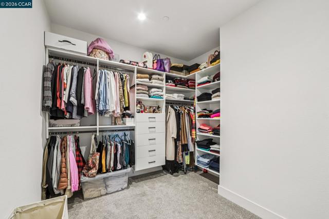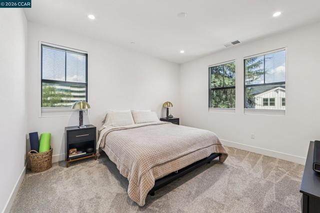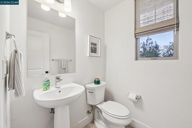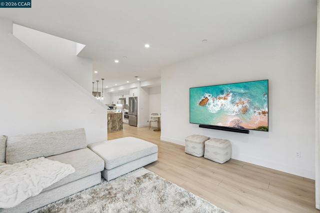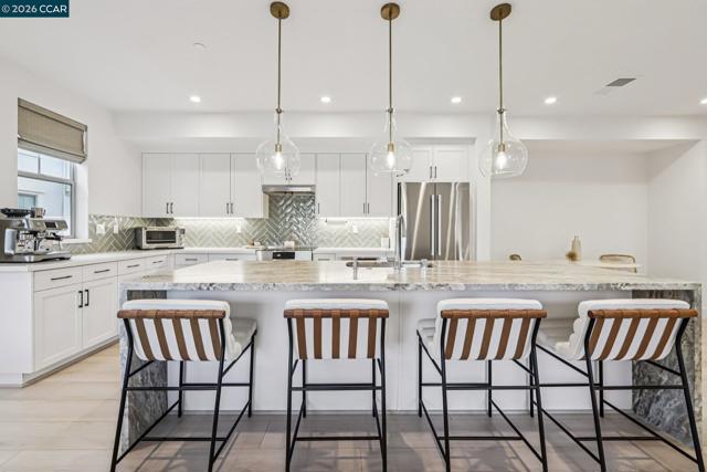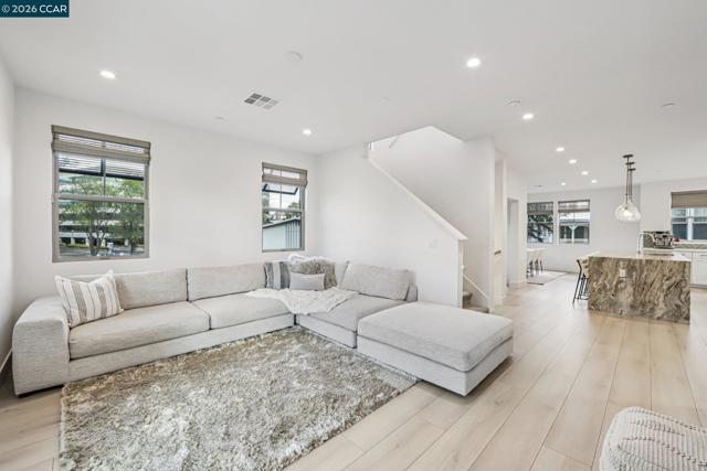 Practically new and beautifully upgraded, this light-filled townhouse-style condominium offers thoughtfully designed living across three levels. As a desirable end unit, it enjoys added privacy, a street-facing location with convenient guest parking, and sits directly next to the community dog park. The entry level features a private bedroom with ensuite bath and direct access to the attached two-car garage, ideal for guests, multigenerational living, or a home office. The main level showcases a stunning kitchen with a waterfall marble island, custom pantry shelving, abundant recessed lighting, and seamless flow into the living and dining areas. A charming office nook, stylish powder bath, and private deck complete the space. Upstairs offers a spacious primary suite, two additional bedrooms, a full bath with double vanity, and a convenient laundry room. Upgrades include owned solar, additional lighting, high-quality window coverings, custom closet shelving in 2 of the rooms, upgraded walk in closets—too many upgrades to mention. Located in the sought-after SummerHill community just one block from BART, with easy freeway access and close to Bay Club. A must-see