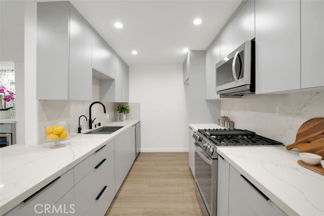 Welcome home! This beautifully reimagined townhouse-style condo in the heart of Sherman Oaks could be yours! This exceptional 2-bedroom, 2.5-bath end unit offers the rare luxury of no neighbors above or below, providing the privacy and quiet feel of single-family living. This unit was fully renovated in 2022. The renovations were thoughtful, high-end upgrades including soundproof drywall, soft-close cabinetry, stainless steel appliances, a built-in wine cooler, and designer finishes throughout. The light-filled living room features an elegant decorative fireplace, custom built-in bar, and convenient powder room downstairs. Flowing effortlessly into the dining area and sleek updated kitchen complete with quartz countertops and modern detailing. Upstairs, two spacious primary suites each offer their own en-suite bath and custom-designed closets, creating ideal comfort and privacy. The top level includes a dedicated laundry area with washer and dryer hookups. There is also access to your own private rooftop deck! This is perfect for entertaining or enjoying serene treetop and mountain views. Additional highlights include two side-by-side parking spaces in a secured gated garage, central air and heat, ample storage, and a low HOA covering water, trash, insurance, and common area maintenance. Ideally located just minutes from Trader Joe’s, Gelson’s, the Sherman Oaks Galleria and easy access to the 101 and 405 freeways. This home offers the perfect blend of modern style, privacy, and prime location in one of the Valley’s most desirable communities. Schedule your private showing today.