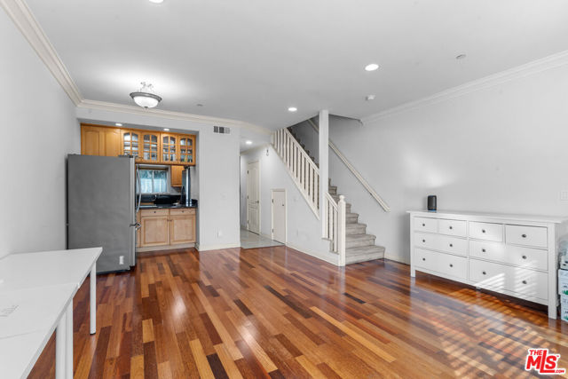 Set in East Hollywood just moments from the vibrant Virgil Village dining scene, this rarely available townhome-style condo offers a unique opportunity in an area where condos are few and far between. Surrounded by local favorites such as Courage Bagels, Doto, and Budonoki, the neighborhood continues to evolve with new restaurants, cafs, and shops, making it an exciting place to call home. Located at the edge of Silver Lake with easy access to the 101 Freeway (north & south), this home combines convenience with urban lifestyle appeal.This modernized two-story residence features 2 bedrooms and 2.5 bathrooms with an open living area highlighted by recessed lighting, hardwood floors, crown moldings, and a cozy gas fireplace. The kitchen is bright and well-ventilated with its own window, and offers granite countertops, stainless steel appliances, abundant cabinetry, a breakfast bar, and travertine tile finishes. A convenient half bathroom on the first level provides easy access for guests or for use while enjoying the main living space.Both upstairs bedrooms feature en-suite bathrooms, windows for natural light, and pleasant open views. The primary suite includes a private balcony and generous closet space, creating a comfortable retreat. Additional highlights include central A/C and heat, a second-floor laundry area with in-unit washer and dryer, extra storage under the staircase, and two underground tandem parking spaces. Notably, the water heater and washer/dryer have been recently replaced, offering added value and peace of mind.A community patio area and pet-friendly HOA complete this exceptional offering in a highly convenient and sought-after location.
