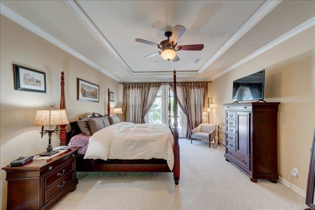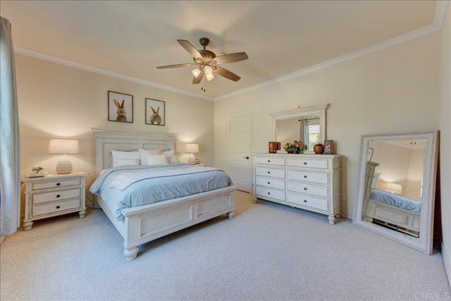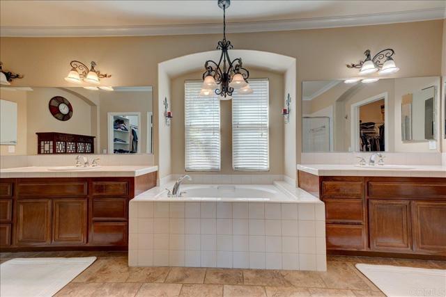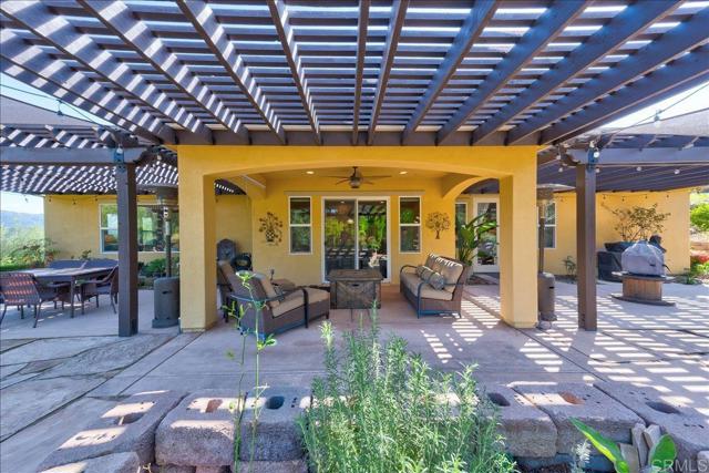 Discover this stunning single-story Tuscan inspired estate in the prestigious gated community of Montreux in North Escondido. Perfectly positioned to capture sweeping mountain views from nearly every room & outdoor living space. This home offers an elegant blend of warmth, sophistication & effortless California living- with a touch of Italian charm. As you drive up the long palm lined driveway you can feel the days stress melt away. An inviting foyer welcomes you leading into hand-scraped hardwood flooring that flows through the formal living & dining rooms where expansive windows frame picturesque views. The heart of the home is the beautifully appointed chef's kitchen featuring a dramatic quartzite island with farmhouse sink, double ovens, warming drawer, microwave, wine beverage cooler & a spacious walk-in pantry. Designed for gathering, the kitchen opens seamlessly to the expansive family room, the perfect setting to enjoy the big game or relax fireside. Architectural details elevate the interior including crown molding, coffered ceilings & refined custom finishes throughout. The private primary suite is a tranquil retreat offering French doors to the covered patio where cool evening breezes & mountain views create a serene escape. The luxurious ensuite bath includes dual vanities, a sit down vanity area, jetted soaking tub, oversized shower & two generous walk-in closets. Each secondary bedroom also features its own walk-in closet, providing comfort & convenience for family or guests. The living room, dining room & patios are wired for surround sound, making indoor-outdoor entertaining effortless. Additional highlights include dual-zoned heating & air, low maintenance landscaping with sprinkler & drip systems, two car & oversized one car (currently set up as a gym) garage, a huge variety of fruit trees (see attached list), ornamental Australian Willows & Magnolias, owned solar & gen 3 Tesla wall connector & so much more. A true entertainer's dream in one of North Escondido's most desirable gated communities.