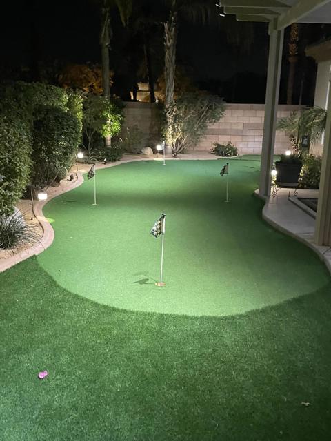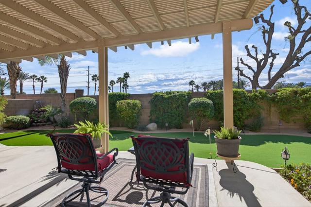 Welcome to this beautifully maintained 2,020 sq. ft. home in the highly desirable Heritage Palms Country Club, where comfort, style, and an active desert lifestyle come together.Step inside and you're immediately greeted by an abundance of natural light. High ceilings, charming eyebrow windows throughout, and an open, flowing floor plan create a bright and welcoming space that feels both spacious and inviting. The oversized great room and dining area are perfect for entertaining, hosting family gatherings, or simply enjoying everyday living, while the open kitchen offers plentiful cabinetry, generous counter space, and a seamless connection to the living areas so you're always part of the moment. The spacious primary suite provides a relaxing retreat, featuring elegant coffered ceilings, beautiful natural light, and a fully remodeled bathroom with a tiled walk-in shower, makeup vanity, and tasteful finishes. Guests will appreciate their own private suite with a separate entry door and a beautifully updated bathroom with a light, modern tiled shower. A large den adds valuable flexibility and can easily serve as a home office, hobby room, media space, or additional guest accommodations. Thoughtful features throughout the home include plantation shutters, ceiling fans, oversized tile flooring in the main living areas, comfortable carpet in the bedrooms, a laundry room with direct garage access, and a large air-conditioned garage with room for a golf cart. Step outside to your beautifully landscaped backyard retreat, complete with a private putting green redone in 2021 -- perfect for relaxing, entertaining, or enjoying quiet desert evenings. Dog lovers will especially appreciate the home's location near the community dog park for added convenience. Living here means enjoying resort-style amenities including golf, tennis, pickleball, pools, fitness classes, dining, and a vibrant social calendar just steps from your door. Plus, you're only minutes from shopping, dining, hiking trails, and the charm of Old Town La Quinta, offering the ideal balance of relaxation and local flavor. This is more than just a home -- it's a place to settle in, make memories, and truly enjoy the best of desert living.