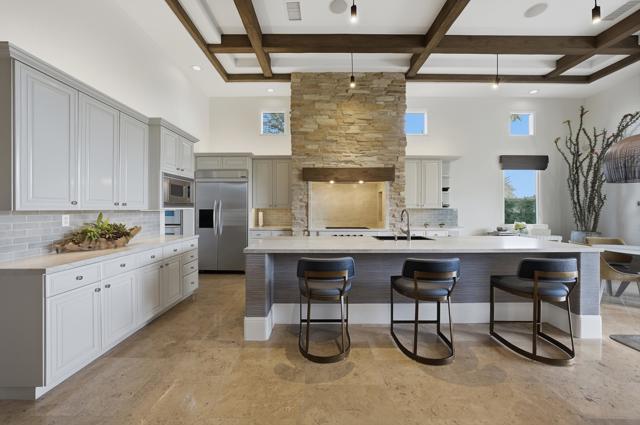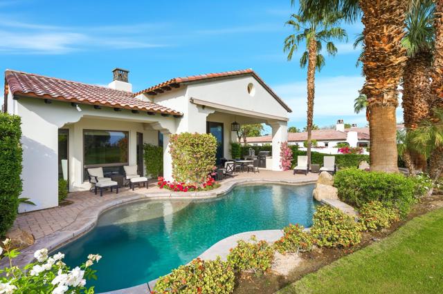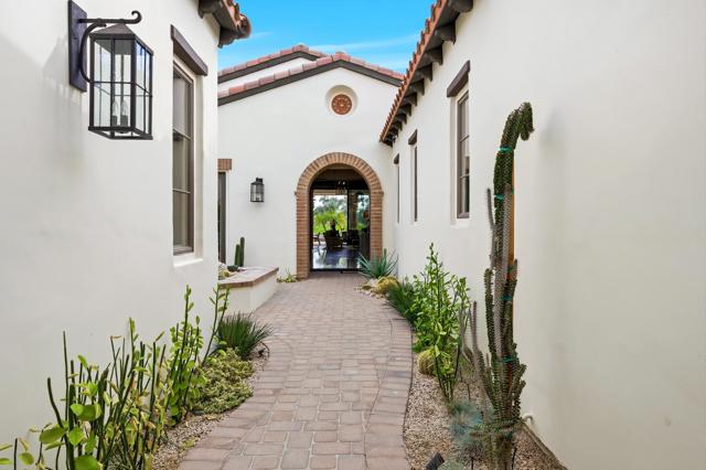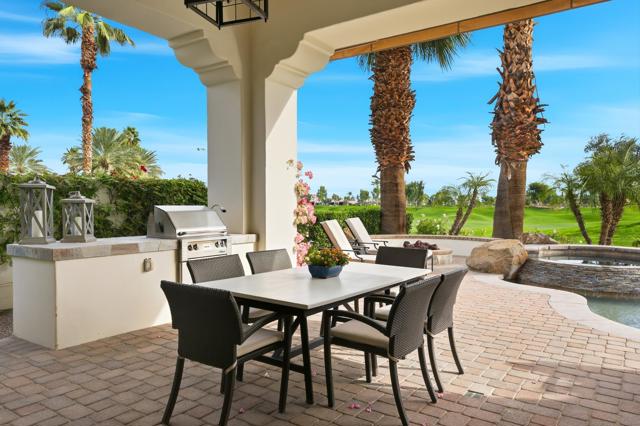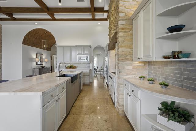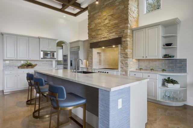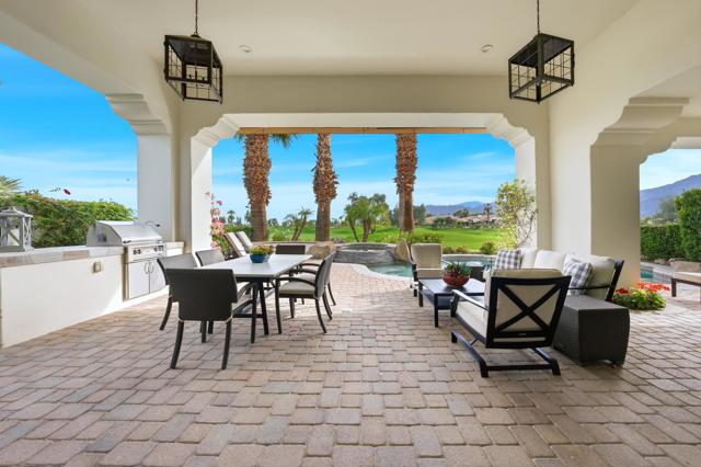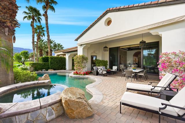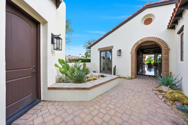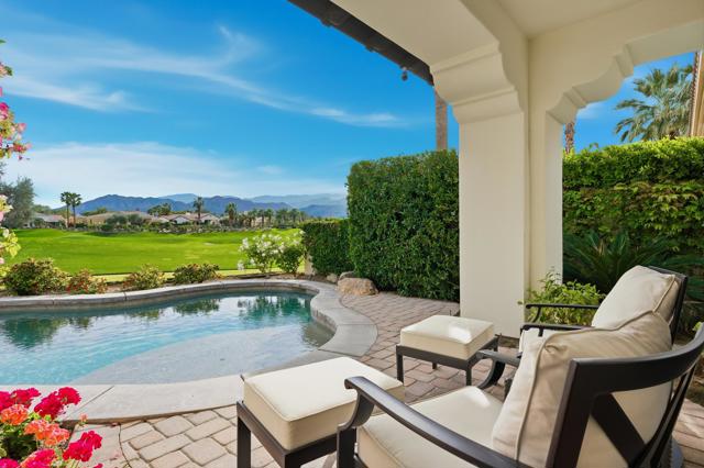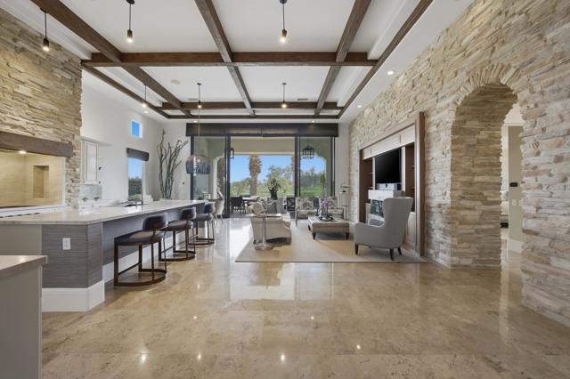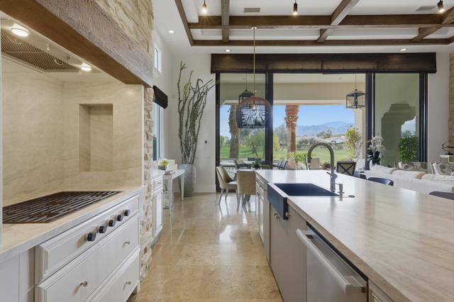 Understated elegance and thoughtful craftsmanship define this extensively refreshed residence, where design and function merge intentionally and effortlessly. Recent renovations transformed the main living spaces by introducing architectural ceiling beams and a refined material palette that adds warmth and depth without overwhelming the home's clean lines. The kitchen makes a quiet yet powerful statement, featuring leathered Taj Mahal quartzite countertops that bring organic texture and subtle movement to the space. A built-in EuroCave wine refrigerator with capacity for 150 bottles offers a dedicated showcase for collectors and entertainers alike, while premium appliances support daily ease. The adjacent butler's pantry is elevated with designer wallpaper, creating a tailored, jewel-box moment between the kitchen and dining area. In the great room, a custom European oak built-in anchors the space, paired with a polished Tundra Grey marble fireplace surround that adds a modern edge. High-end designer furnishings complement the architectural upgrades and reinforce the home's cohesive aesthetic. The powder bath features quarter-sawn mahogany cabinetry topped with honed Caesarstone, blending rich wood grain with sleek stone surfaces. Throughout the home, professionally polished travertine floors enhance their natural character and lend a fresh, refined feel. A dedicated office provides a private and flexible workspace, ideal for remote work or creative pursuits. Beyond the main residence, a detached two-bedroom casita offers a private retreat for guests. Ideally positioned on a premier end lot adjacent to a greenbelt, the property enjoys sweeping south-facing views across the third fairway of the Rees Jones designed golf course at Andalusia Country Club. The panoramic backdrop of the Santa Rosa and Coral Mountains creates a dramatic and ever-changing setting, capturing the beauty of desert light from sunrise to sunset. Come live the life you've always imagined!