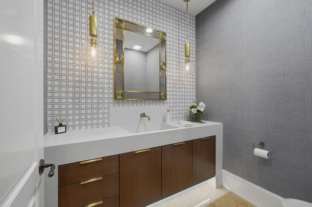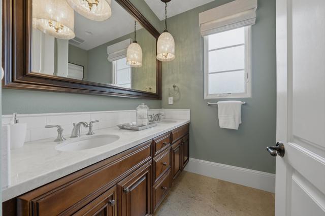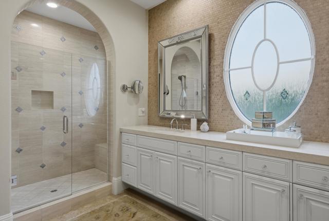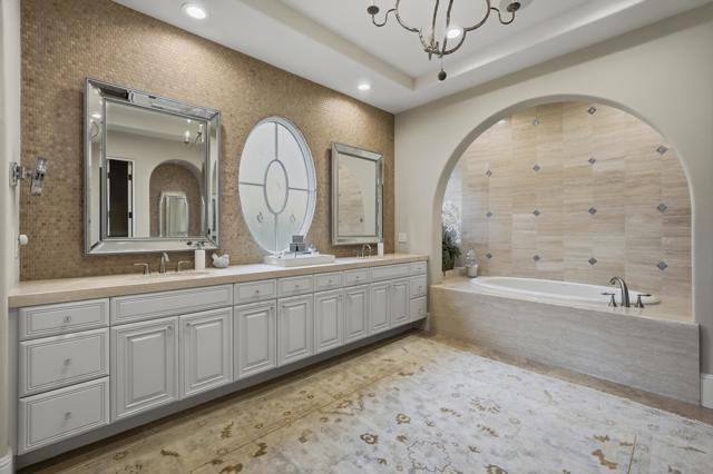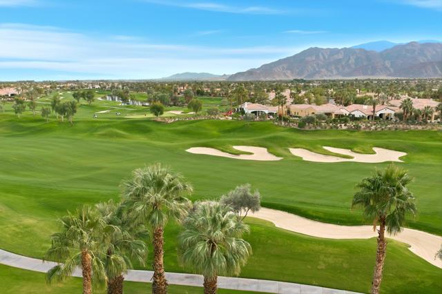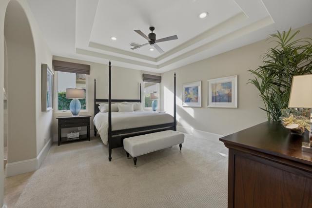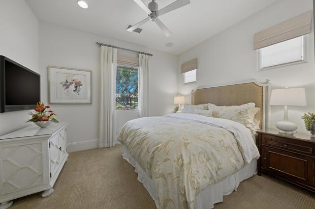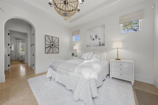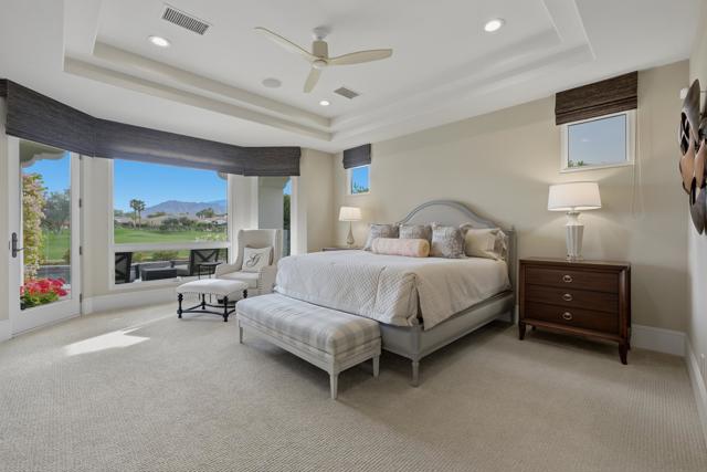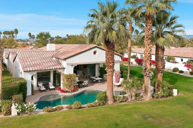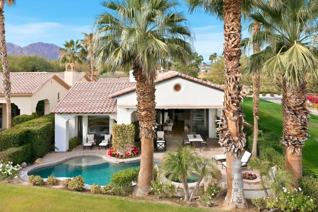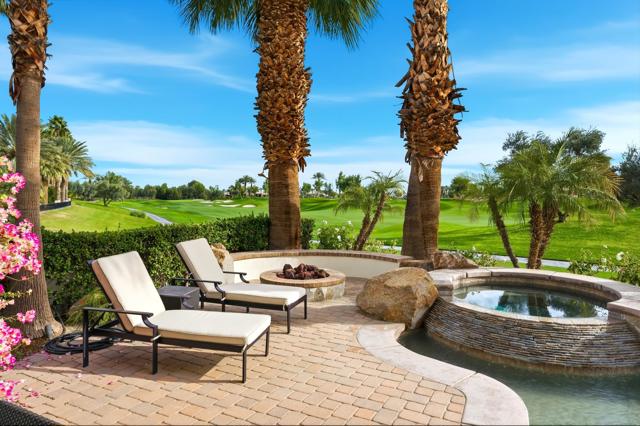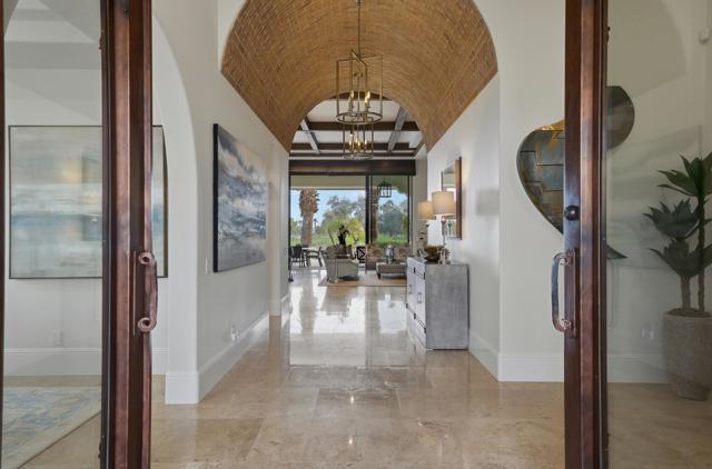 Understated elegance and thoughtful craftsmanship define this extensively refreshed residence, where design and function merge intentionally and effortlessly. Recent renovations transformed the main living spaces by introducing architectural ceiling beams and a refined material palette that adds warmth and depth without overwhelming the home's clean lines. The kitchen makes a quiet yet powerful statement, featuring leathered Taj Mahal quartzite countertops that bring organic texture and subtle movement to the space. A built-in EuroCave wine refrigerator with capacity for 150 bottles offers a dedicated showcase for collectors and entertainers alike, while premium appliances support daily ease. The adjacent butler's pantry is elevated with designer wallpaper, creating a tailored, jewel-box moment between the kitchen and dining area. In the great room, a custom European oak built-in anchors the space, paired with a polished Tundra Grey marble fireplace surround that adds a modern edge. High-end designer furnishings complement the architectural upgrades and reinforce the home's cohesive aesthetic. The powder bath features quarter-sawn mahogany cabinetry topped with honed Caesarstone, blending rich wood grain with sleek stone surfaces. Throughout the home, professionally polished travertine floors enhance their natural character and lend a fresh, refined feel. A dedicated office provides a private and flexible workspace, ideal for remote work or creative pursuits. Beyond the main residence, a detached two-bedroom casita offers a private retreat for guests. Ideally positioned on a premier end lot adjacent to a greenbelt, the property enjoys sweeping south-facing views across the third fairway of the Rees Jones designed golf course at Andalusia Country Club. The panoramic backdrop of the Santa Rosa and Coral Mountains creates a dramatic and ever-changing setting, capturing the beauty of desert light from sunrise to sunset. Come live the life you've always imagined!