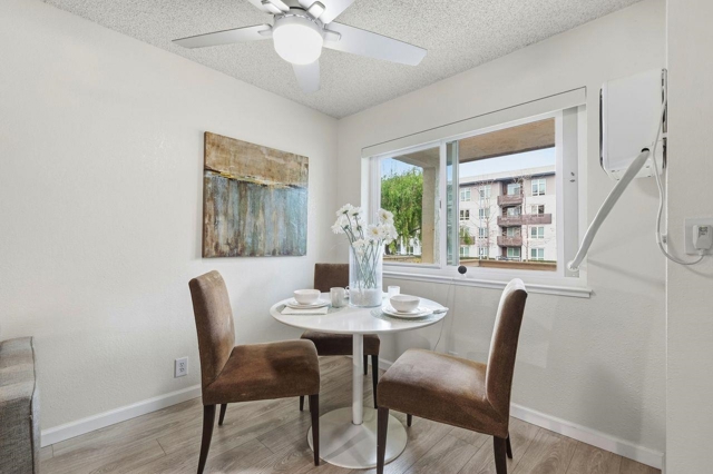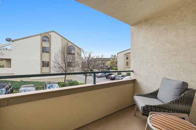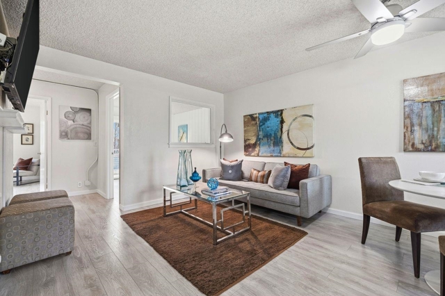 Approximately 732 square feet of thoughtfully designed living space awaits in this condominium. The unit features 2 bedrooms & 1 bath, offering versatile accommodations. The home's beautiful layout is enhanced by abundant natural light, which floods the interior through the large windows. Laminate flooring lends a warm, inviting ambiance throughout. The primary bedroom provides generous closet space, complemented by a neutral color palette & bright lighting. The bathroom features ample vanity space & a neutral decor that promotes a relaxing atmosphere. The kitchen is bright, spacious & functional, w/ abundant countertops for meal preparation. Stepping outside, you'll find lush landscaping & well-maintained exterior grounds. The front patio & rear balcony provide the perfect spot to enjoy outdoor seating. The covered entrance & landscaped grounds contribute to the home's curb appeal & ideal location. A private garage w/ additional storage and EV charger capability enhances practicality. Residents can also take advantage of the inviting pool, offering a refreshing retreat. This home presents an ideal living environment w/ its thoughtful design & desirable amenities. The neutral tones & abundant natural light create a welcoming home to enjoy! OPEN HOUSES SAT-SUN, 2/21-2/22, 1-3 PM
