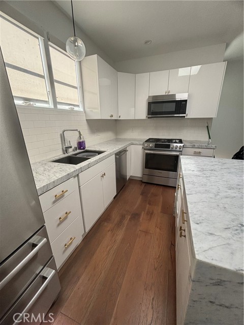 This Charming unit is impeccably remolded with an open floor plan to maximize your space.It features 3 bedroom 2 full bath with hardwood flooring, all appliances, marble counter tops, central ac/heat, recessed lighting, yard space ,2 car covered parking, automatic gate, and fully secured.