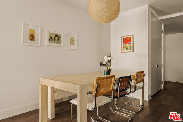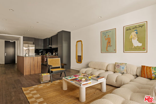 The residence unfolds with warm, thoughtful design and clean architecture, layered with texture and modern details. The open-plan layout is anchored by a striking kitchen that balances function and design: custom flat-front cabinetry in rich wood and charcoal tones pairs beautifully with sleek black stone countertops. Professional-grade Wolf appliances, a stainless steel vent hood, and an integrated Sub-Zero refrigerator elevate the kitchen into a true culinary workspace, while a waterfall island with an oversized sink invites both cooking and gathering. Adjacent to the kitchen, a dedicated dining area comfortably accommodates a full dining table, making it ideal for entertaining. Beyond the kitchen, the living area is framed by expansive windows that bring in soft daylight, along with a generous seating area. The flow between kitchen, dining, and living spaces feels seamless yet intentional, making the home equally suited for hosting or quiet retreat. Sliding glass doors and large panes of glass visually extend the living space outward, in addition to a large balcony. The bedroom is serene and spacious, offering room for a king-size bed and additional furnishings without compromising openness. Floor-to-ceiling windows continue the theme of light and calm, while custom window treatments provide privacy. The ensuite bathroom features a long stone vanity with ample storage and a walk-in glass shower. Finishes are clean, modern, and timeless. Completing the residence is a discreet laundry closet with full-size Whirlpool washer and dryer and custom upper cabinetry. It's a space designed for contemporary living, where beauty and functionality exist in equal measure, offering a refined yet effortless place to call home.