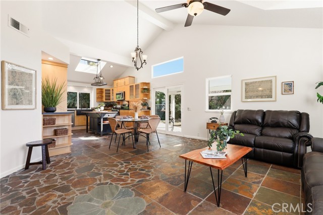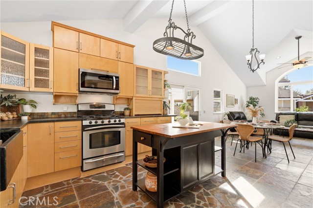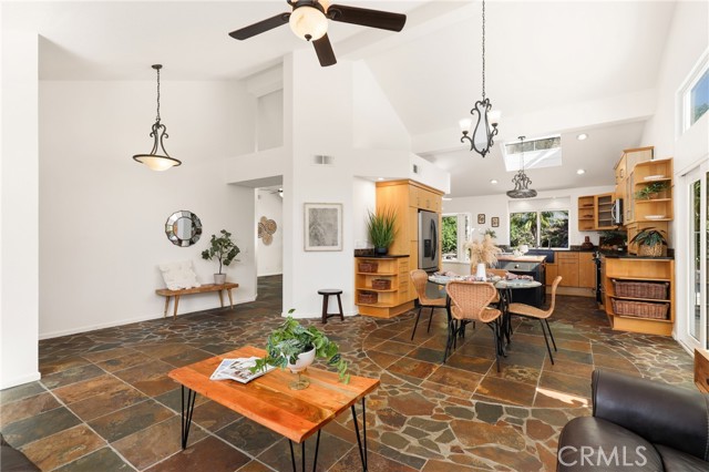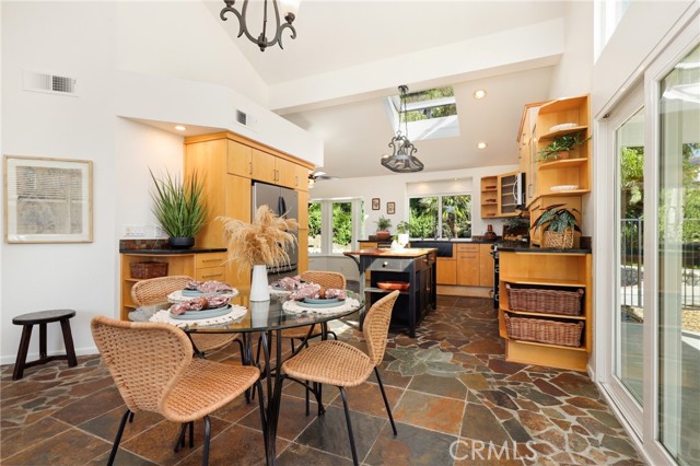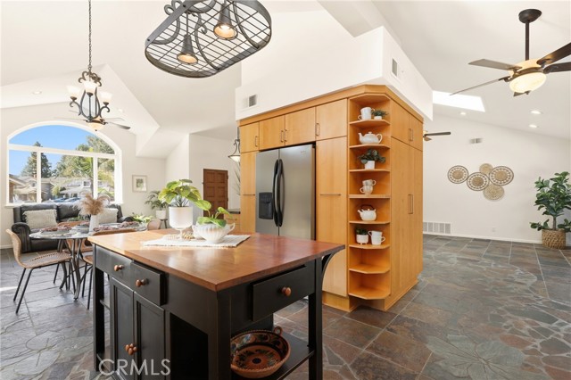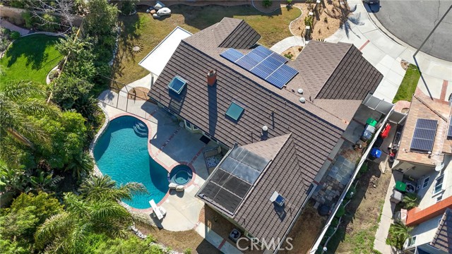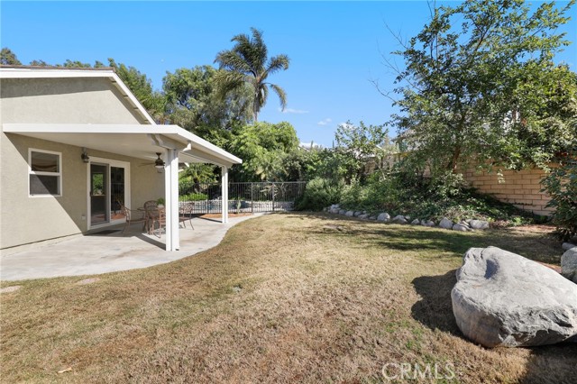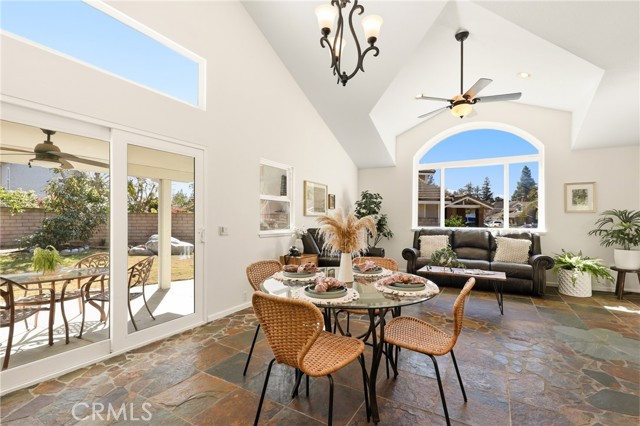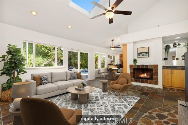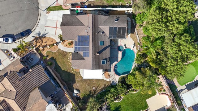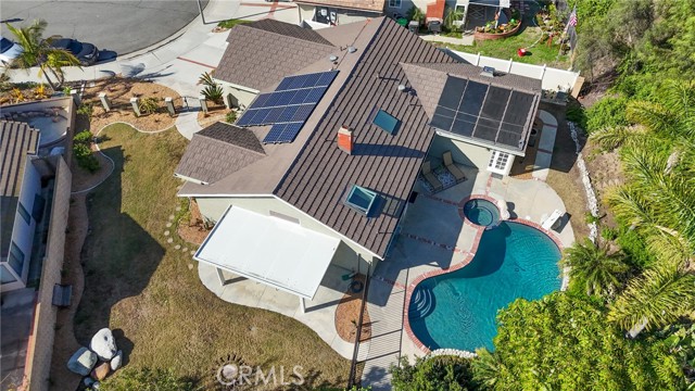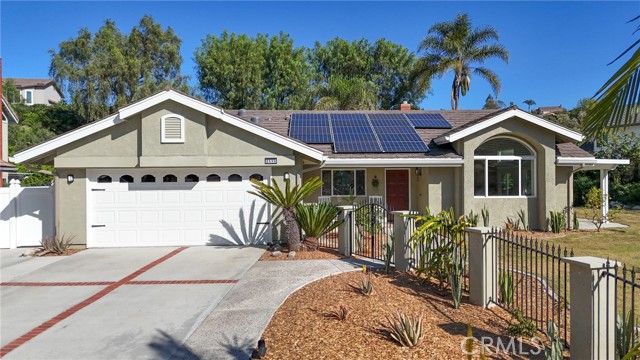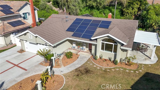 Tucked away at the end of a peaceful cul de sac in the highly sought after Orange Hills, 2533 N Shady Forest Lane is an energy efficient organic modern home offering a rare single story four bedroom layout on an oversized lot designed for comfortable living and effortless entertaining. Soaring ceilings and operable skylights fill the open concept great room with natural light, highlighting custom stone mosaic slate flooring that anchors the living spaces with warmth and durability. The family room features a fireplace and wet bar area that connects seamlessly to the kitchen and backyard. The kitchen showcases slab style cabinetry, artisanal soapstone counters and a matching hand carved soapstone farm sink, all set within a generous footprint that flows easily into the main living and dining areas. The primary suite offers a private retreat with a walk-in closet and a spacious bathroom featuring a dual sink vanity and oversized tub and shower combination. An indoor laundry room with storage and utility sink adds everyday convenience. Major value features include a fully prepaid Sunrun solar system through 2033 with no payments for the buyer to assume, a solar thermal system for pool and spa heating, and a high efficiency heat pump HVAC system providing both heating and air conditioning. Recent improvements include a freshly resurfaced Mini Pebble pool and spa completed in 2025, new interior paint, and new low berber carpet installed in January 2026. The backyard offers lush landscaping, a large separately fenced side yard with grass, and a shaded patio ideal for outdoor dining. Additional highlights include a metal roof, enhanced insulation, double pane windows, ceiling fans, a two car garage, and generous driveway parking. Located within the Villa Park school attendance area and minutes to Orange Lutheran High School, parks, shopping, dining, and convenient freeway access, this home offers style, efficiency, and functionality that is hard to find.