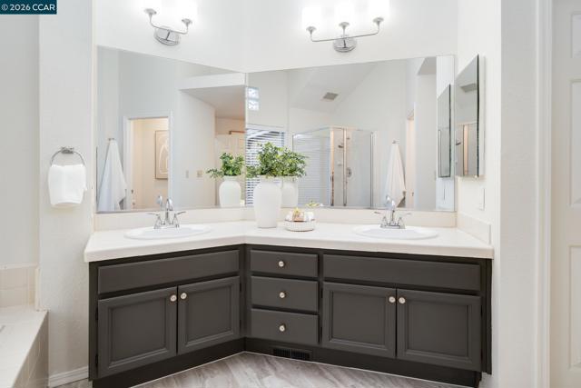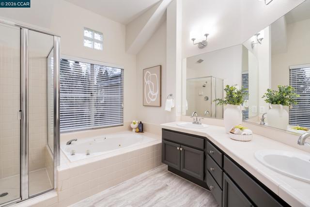 Welcome to this beautifully updated home located within the resort-like, gated Canyon Lakes Country Club community. With no direct rear neighbors, this residence offers privacy, space, and abundant natural light throughout. Soaring ceilings and expansive windows create an airy, open feel, complemented by new custom light fixtures, fresh interior paint, and newly installed flooring throughout. An upstairs loft provides the perfect flex space for a home office, reading nook, or secondary sitting area. The beautifully appointed kitchen features freshly painted cabinetry with new hardware, a stylish backsplash, bar seating, a built-in microwave and dishwasher, and a charming breakfast nook ideal for casual dining. The primary bedroom retreat boasts serene views, vaulted ceiling, and a built-in cabinet for added functionality. The ensuite bathroom includes dual sinks, a soaking tub, a stall shower, and a spacious walk-in closet. Additionally, this home offers a low maintenance, serene backyard setting with a patio and new lawn. Enjoy amenities including clubhouse, community pool and tennis courts. Close to award winning San Ramon Valley schools, golf courses and shopping/dining at the City Center.