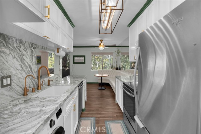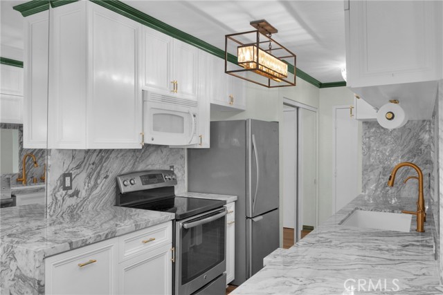Perched on the top floor, this single-story 2-bedroom, 2-bath corner residence equipped with 2 private balconies and a private washer and dryer inside the home offers an unmatched level of convenience and exclusivity. Flooded with natural east-facing light, the home features elegant chandelier lighting, expansive windows, and two private balconies overlooking lush greenery for a tranquil Hollywood retreat. Over $50,000 in thoughtfully curated upgrades elevate the space, including an enlarged chef’s kitchen with stainless steel appliances, custom italian marble countertops and backsplash, and sleek modern finishes. Both bathrooms have been newly renovated to showcase luxurious onyx and Italian marble countertops, delivering a spa-inspired experience. Year-round comfort is ensured with a brand-new AC and heating system, while ample custom storage enhances everyday functionality. The residence includes three total parking spaces, featuring secure gated tandem parking for two plus an additional dedicated spot. Located moments from the Hollywood Bowl, theaters, dining, shopping, and major freeways, this sophisticated home offers the perfect balance of peaceful living and iconic Hollywood energy.