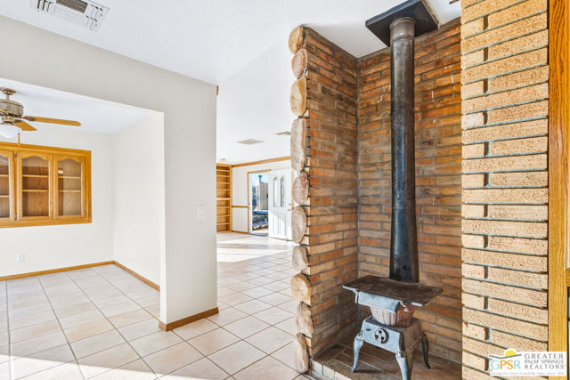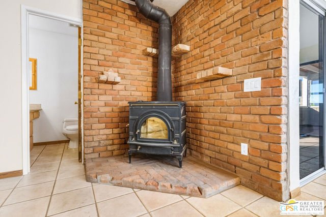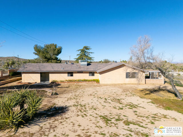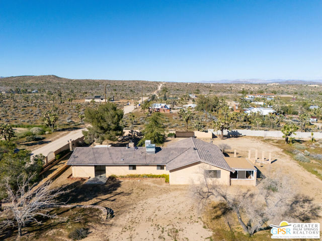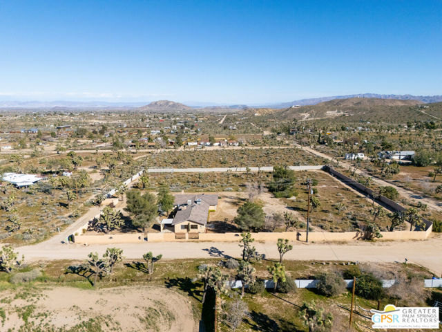 LOOKING FOR A PRIVATE WALLED GATED ESTATE TYPE PROPERTY? THIS IS IT. A unique property with a cabin type feel with a beautiful rock fireplace in the great room. Two small stove fireplaces one in the kitchen and one in the primary. Great floor plan with big primary with attached jacuzzi room and sun porch. HUGE PROPERTY with room for ADU, TENNIS COURT, POOL or extra garage buildings if you're a car collector or a contractor with work vehicles. Open and expansive desert views. THIS ONE IS SPECIAL AND HAS SO MUCH POTENTIAL.
