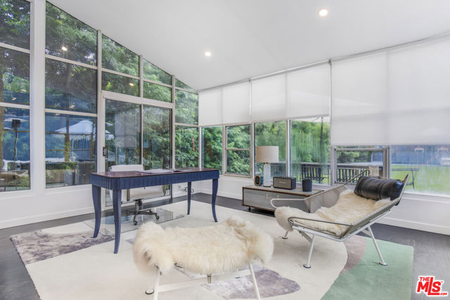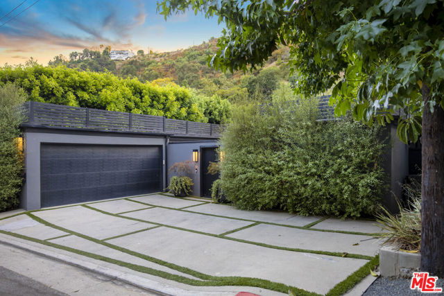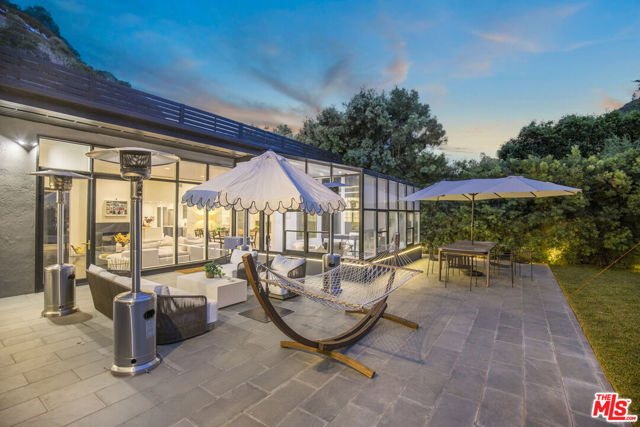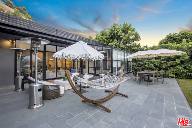 Stylish bungalow inspired home on an exceptional double lot in the heart of Beverly Hills, framed by lush, serene landscaping. This contemporary estate offers a private courtyard entrance ideal for gatherings, flowing into a welcoming foyer and striking floor to ceiling glass living room. A light filled atrium office and expansive grassy grounds complete the main living spaces. The primary retreat is thoughtfully designed with a fireplace, generous walk in closets, and a spa like bathroom featuring a soaking tub, glass shower, and sauna, with direct access to the outdoor lounge. The adjacent guest bedroom provides ample closet space and a full bath with glass shower and tub. The renovated kitchen is flooded with natural light and opens to a cozy dining area and third bedroom with en-suite bath. Outside, discover a sprawling backyard oasis perfect for entertaining, relaxing, or play, highlighted by a dramatic triple waterfall pool and spa, plus a separate hillside rear entrance with additional street parking. Ideally situated near Sunset Boulevard shopping and dining, and just minutes from the hiking trails at Franklin Canyon Park.