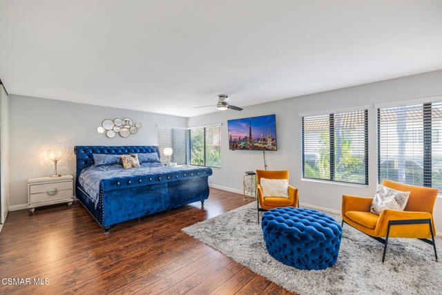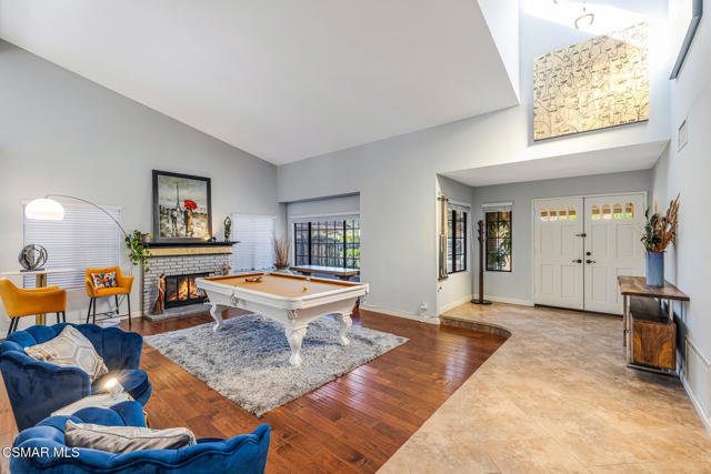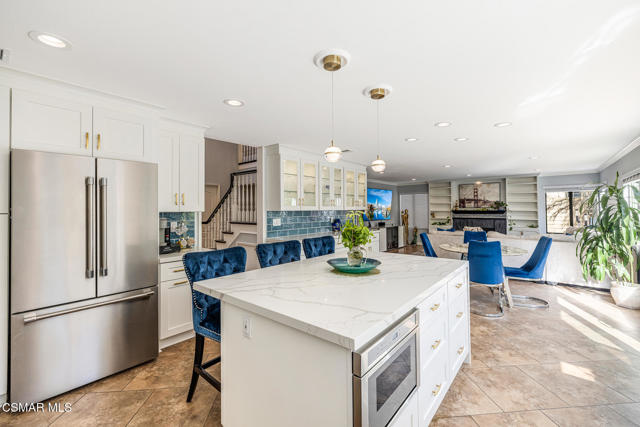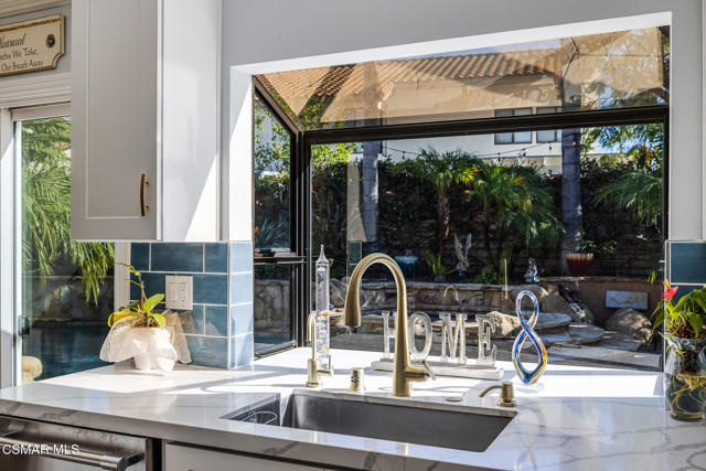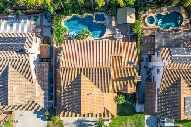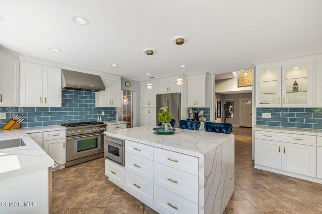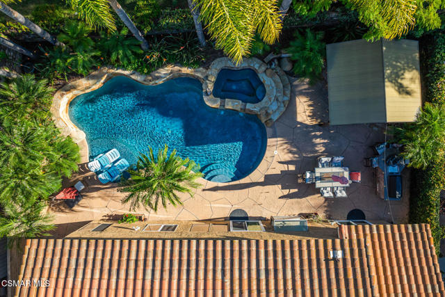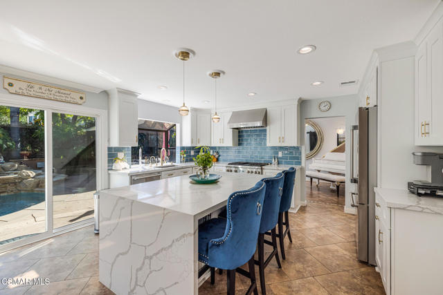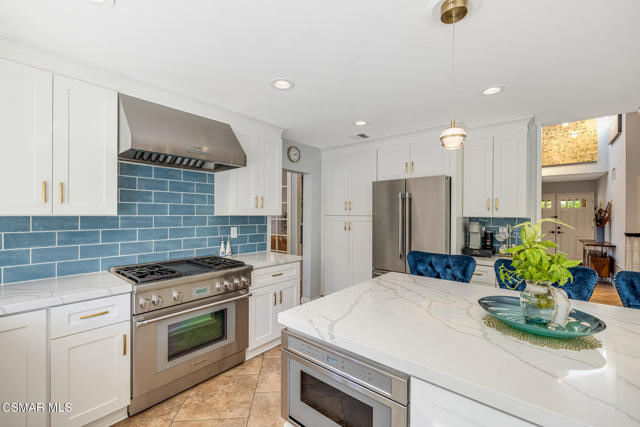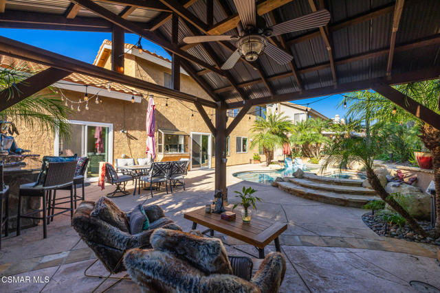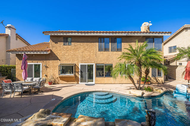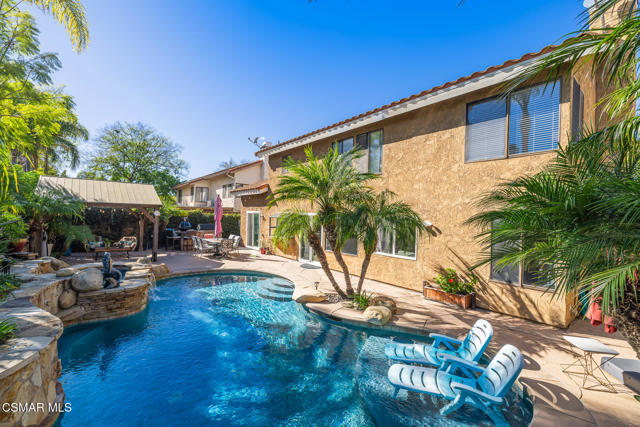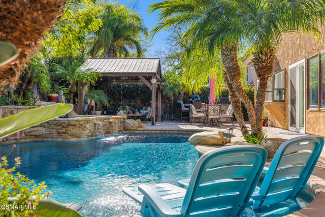 Discover this beautifully appointed 5-bedroom, 3-bath ''resort style'' pool home with over 3,000 square feet of well-designed living space, nestled within the desirable Buttercreek/Mountain Meadows community. From the moment you step through the double door entry, you'll appreciate the thoughtful layout, soaring ceilings and seamless flow between formal and casual spaces. Rich wood-like flooring anchors the main living areas, while expansive windows fill the home with natural light. The remodeled gourmet kitchen is the true centerpiece, featuring quartz countertops, a dramatic waterfall-edge island, and soft-close custom cabinetry. The Thermador stainless steel appliances are every chef's dream including a 4-burner stove top with large griddle surface. The kitchen is perfectly positioned, open to the family room and adjacent to the formal dining room for effortless entertaining. Whether hosting holidays or enjoying everyday meals at the breakfast counter, this home was designed for gathering. The flexible floor plan includes a main-level bedroom and full bath, ideal for guests or multigenerational living. Upstairs, retreat to the spacious primary suite that is flooded with light, complete with a private sitting area, grand walk-in closet and spa-inspired bathroom to complete your sanctuary. Custom built-out closets throughout the generous sized upstairs rooms provide exceptional organization and storage. Step outside to your private backyard oasis featuring a sparkling in-ground pool with a baja shelf and inviting spa, or relax under the pergola with the electric fireplace glowing while you watch the game late into the evening. Making this your new address will feel like living in a 5-Star hotel and all you have to do is step out the sliding glass door. With a 3-car attached garage, individual laundry room, central air and heat, and access to HOA amenities (including a community pool), this home offers both luxury and convenience. Beautifully appointed, well laid out, and move-in ready this is Moorpark living at its finest.
