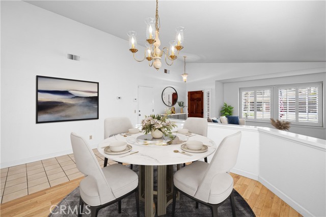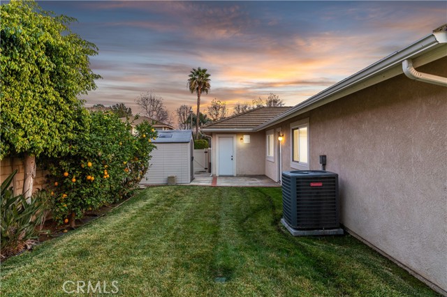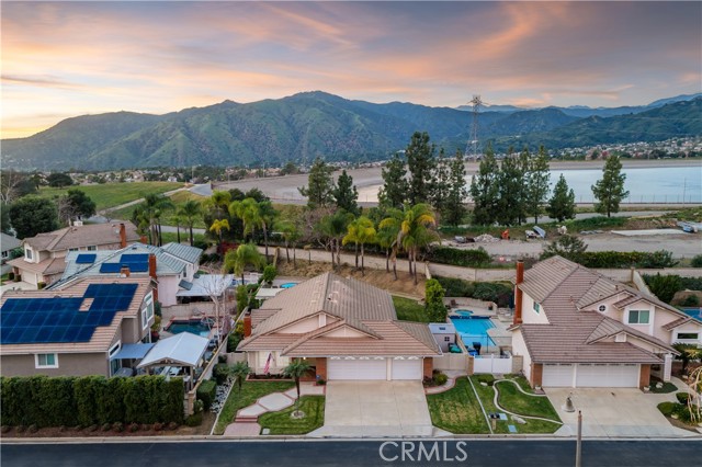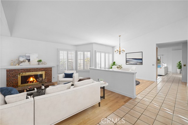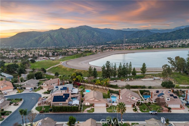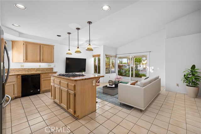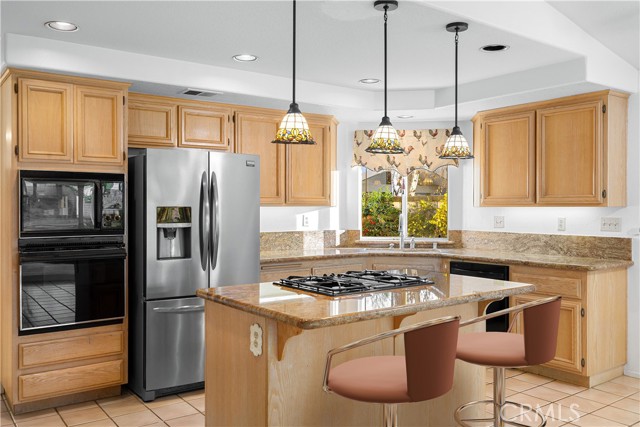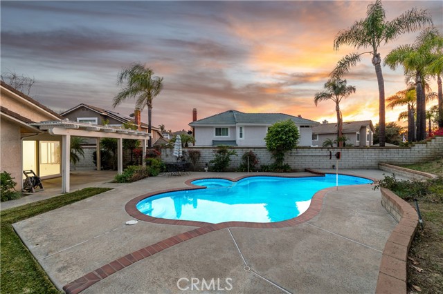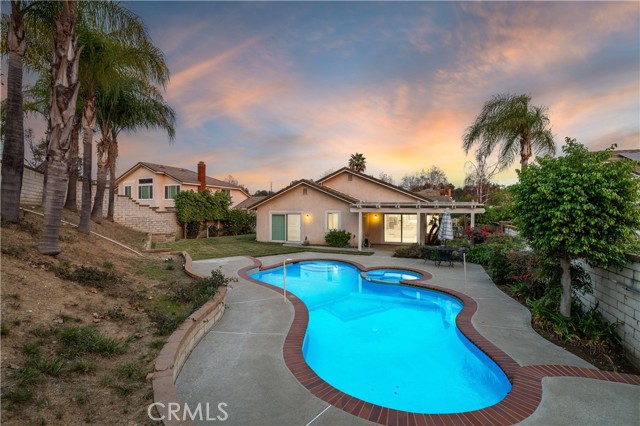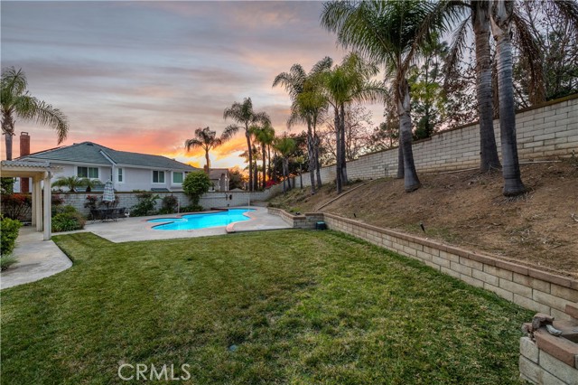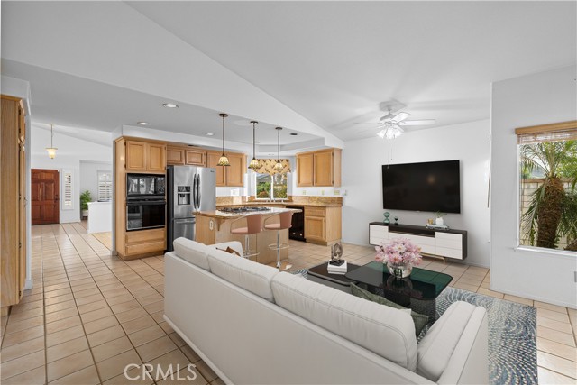 Single-story pool home located on a quiet cul-de-sac within the gated Emerald Ridge at Live Oak community. The front yard features a manicured lawn, brick ribbon walkway, brick planters, RV access, and a covered porch entry. The front door opens to a bright interior with vaulted ceilings and a tiled entry. The formal living room is positioned at the front of the home and offers hardwood flooring, a brick fireplace with mantel, and plantation shuttered windows, including a one overlooking the front yard. The adjacent dining room features a chandelier and additional shuttered windows with side yard views. The open kitchen includes wood cabinetry, granite countertops, and recessed lighting. A center island with cooktop, pendant lighting, and countertop seating connects the kitchen to the family room, which features vaulted ceilings, tiled flooring, and a sliding glass door providing direct backyard access. The primary suite offers vaulted ceilings with ceiling fan, hardwood flooring, a walk-in closet, and a spanning sliding door with plantation shutters opening to the backyard. The primary bath includes dual sinks with granite counters, a walk-in shower with glass enclosure, and a separate soaking tub. Two additional bedrooms feature wood flooring, vaulted ceilings, and spacious closets. A hall bathroom and a dedicated laundry room with cabinetry and backyard access complete the interior. The backyard offers a pool and spa with brick coping and concrete decking, a covered patio structure, a large grass area, RV parking with an extended side yard, mature landscaping, perimeter block walls, and a hillside backdrop. HVAC is newer.