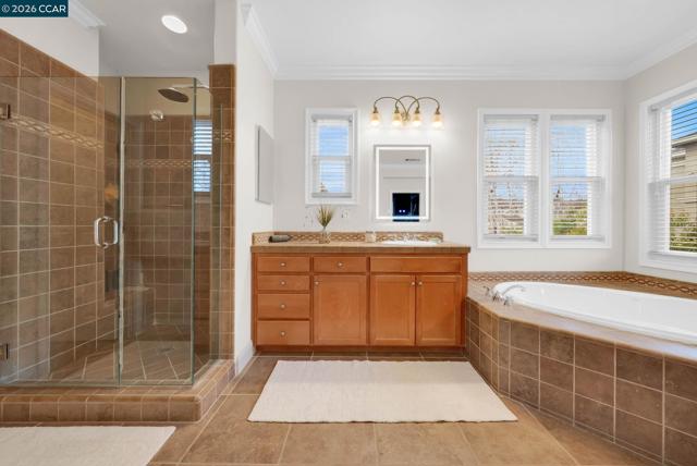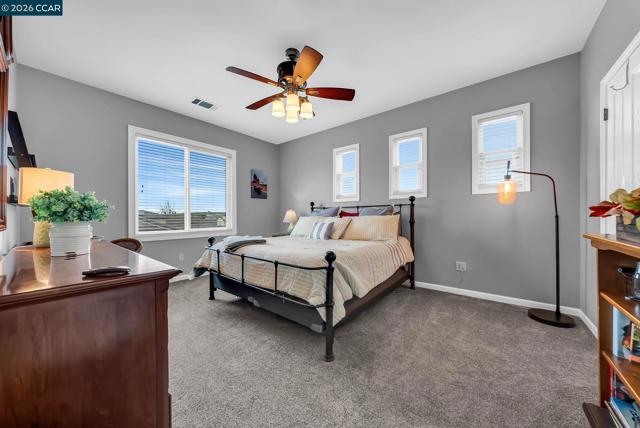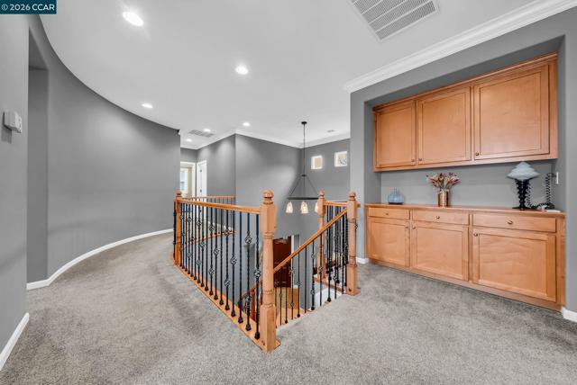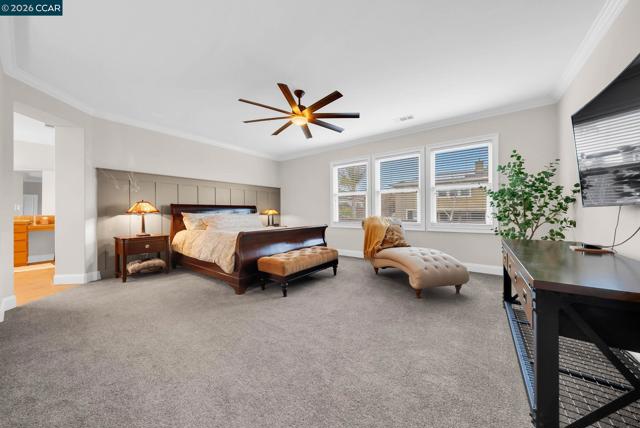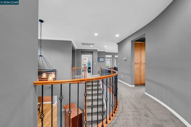 Located on a quiet street in desirable Benicia, this upgraded 4-bed, 3.5-bath home offers over 3,500 SF of flexible living space. A welcoming front porch features a shiplap ceiling with crown molding. Inside, newer hardwood floors highlight the main living areas, with carpeting in bedrooms for added comfort. Crown molding, wood-trimmed windows, and a wrought-iron stair railing add timeless character. The kitchen features a breakfast bar, generous counter space, and newer gas range, oven, microwave, and dishwasher, flowing into dining and living areas. Multiple living spaces, including a formal dining room and upstairs loft, provide flexibility for work or entertaining. A rare downstairs ensuite bedroom is ideal for guests, multigenerational living, or a private office. Upstairs, the primary suite offers a custom walk-in closet and ensuite with dual sinks and soaking tub. The fully fenced backyard includes a serene waterfall, two pergolas, newer redwood fencing, and mature landscaping with fruit trees. Additional features include dual-zone HVAC, dual-pane windows with treatments, laundry room with W/D, exterior shed, and a rare four-car garage. Walkable to Matthew Turner and Benicia Community Park, with trails to Lake Herman and nearby open space. Minutes from downtown.