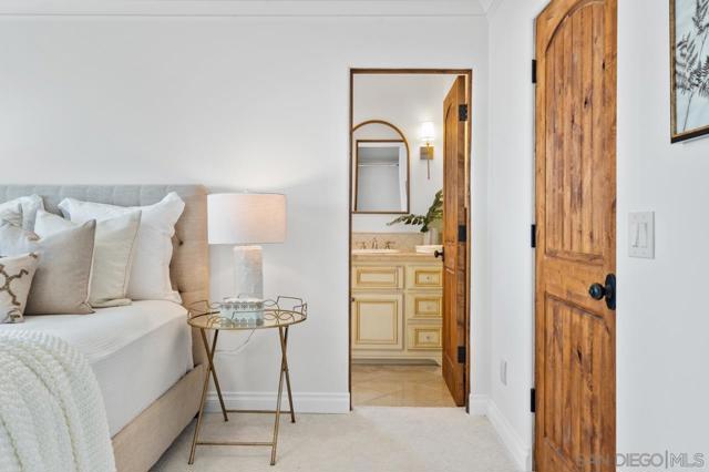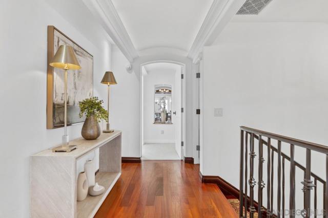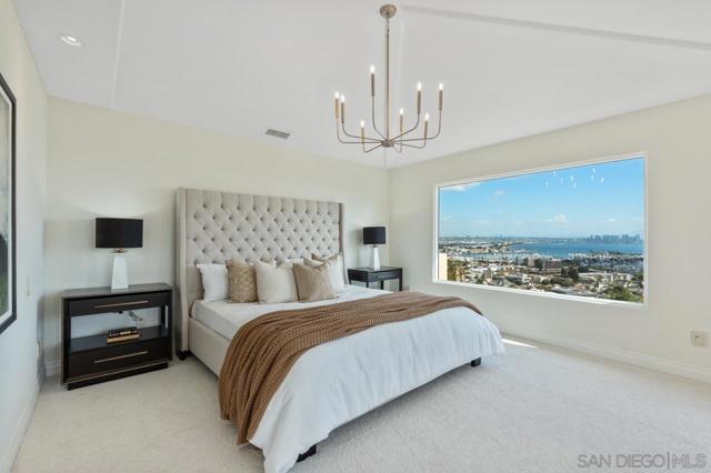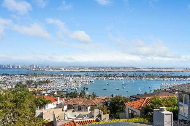 At 3235 Harbor View Drive, the name isn't aspirational; it's an understatement. This expansive Mediterranean, five-bedroom Point Loma residence commands a rare, sweeping panorama. Mountain sunrises unfold across Shelter Island's mast-lined marinas and expand over the glittering expanse of San Diego Bay and the Pacific beyond. Virtually every room is framed by a different chapter of that view. A true chef's kitchen, outfitted with high-end appliances, and ample cabinetry, fuses with a living space designed for the kind of gatherings where nobody wants to leave. A dedicated office overlooks the bay, turning the daily grind into something closer to meditation. Thoughtful details elevate the everyday: a built-in dumbwaiter ferries groceries from the attached garage level up to kitchen, and a second detached garage off the rear alley is ideal for additional vehicles or future creative use. Architectural details elevate the experience at every turn, from softly arched barreled hallways that guide you through the home to wrought iron Juliet balconies that frame the bay and invite in ocean breezes. Step outside to a spacious view patio and an enchanting, private yard, and you begin to understand why this address delivers an unmatched lifestyle. All of this is just minutes from Liberty Station’s dining and arts scene, the beaches of Sunset Cliffs, highly regarded schools, local yacht clubs and downtown San Diego. This is not simply a home with an incredible view. It is a front-row seat to the best of Point Loma living: elevated, private, and endlessly inspiring. Soaring vaulted ceilings with exposed wood beams lend the open kitchen, dining, and living areas a warmth and scale that few homes on the peninsula can match. Rich hardwood floors carry through the primary living spaces. The kitchen centers on a curved, furniture-grade island with granite countertops and a professional-grade Wolf six-burner range. The office is a showpiece in its own right: ornate pressed-tin coffered ceiling panels in a copper finish, dark wood millwork, built-in library shelving, and dual French doors opening onto a pair of wrought iron Juliet balconies overlooking the bay. A wet bar and additional seating area are just outside the office. The primary suite's walk-in closet features custom built-in cabinetry and skylights, while the en suite bath is finished with natural stone countertops and crystal sconces. Outdoor living unfolds across multiple levels, including a pergola-shaded Saltillo tile courtyard with vine-covered lattice privacy walls and lantern lighting, plus a separate terracotta-tiled balcony overlooking the yard. Mature tropical landscaping, towering palms, a columned entry portico, and a wrought iron pedestrian gate complete a property where the craftsmanship was considered as carefully as the address.