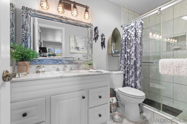 Carlsbad lagoon living at its finest! Perfect mix of coastal charm and beautifully designed modern luxury. Every corner shows careful attention to detail. This tranquil, hidden gem offers everyday comfort, style and relaxation. Spacious condo located on the ground level with updated windows and sliding doors. Beautiful flooring throughout the open floor plan, cozy fireplace, built-in cabinetry, wooden shutters, elevated lighting fixtures and wood beam ceilings showcase this homes elegance. The fully updated kitchen features beautiful stainless-steel appliances, countertops, cabinetry with pullout shelves and self-closing doors. The Eat in kitchen has custom built-in shelving and a patio for your morning coffee. The wallpapered powder room is also a treat! The two large en-suite bedrooms each offer bay windows. The primary bedrooms have two sets of closets and custom lighting fixtures that flow into a gorgeous bathroom. Laundry closet with full sized washer and dryer is conveniently located upstairs. The oversized patio off the living room overlooks the lush landscaping, pool and spa. The community grounds are a tropical paradise with water features, ponds, bridges, gazebos and BBQ. This condo has an attached garage with direct access to home. Windsong Cove is a gated community situated along Agua Hedionda Lagoon, West of I-5. Walking distance to The Village of Carlsbad’s pristine beaches, boutiques, Michelin fine dining restaurants, breweries and wineries. Carlsbad offers seven miles of coastline, golf courses and top-rated schools. Weekly farmers markets and Street Faire support local farmers and artists! The Carlsbad Train Station takes you to Petco Park to catch the Padres or easily to Los Angeles. Jump on the I-5 Freeway to visit the Flower Fields, Legoland, Seaworld or the San Diego Zoo!