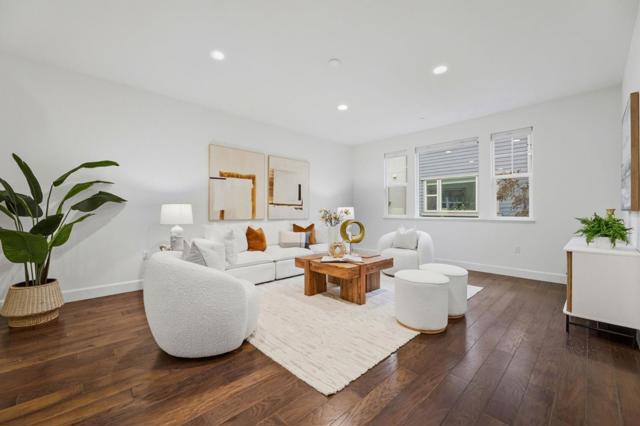 This bright and spacious townhouse offers 1,914 sqft of modern luxury in a rare and highly sought-after 4-bedroom, 3.5-bathroom layout. The open-concept interior features hardwood floors throughout and a gourmet kitchen equipped with Quartz countertops, white Shaker cabinets with pull-out drawers, and professional-grade stainless steel appliances. Designed for flexibility and comfort, the home includes updated elegant bathrooms, an airy balcony for retreat, a convenient two-car side-by-side garage, and a first-floor bedroom with a full bath perfect for guests or rental income. Complete with multi-zone AC and a premium customized walk-in closet in the master bedroom, this home is perfectly situated in a prime location within the community, just minutes from Downtown Sunnyvale and major Silicon Valley tech hubs.