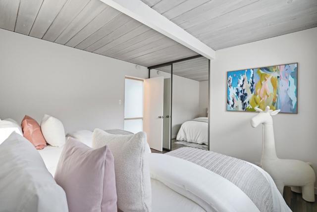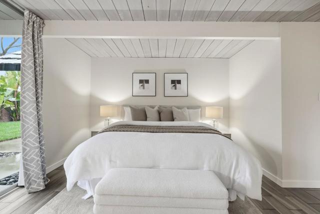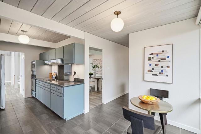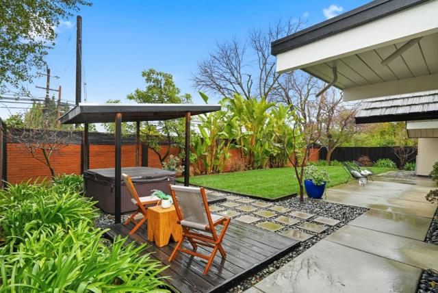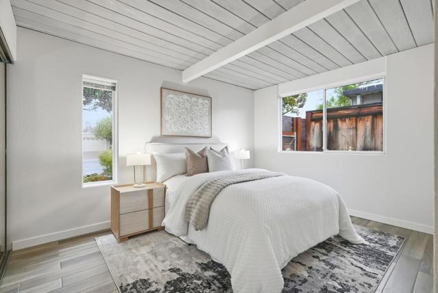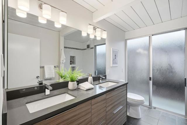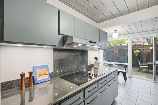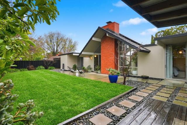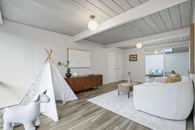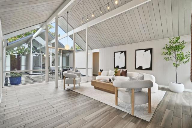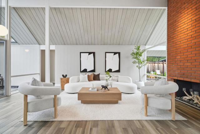 With a rare 2,308 sq ft spacious floorplan, this updated double A frame model Eichler embodies the epitome of indoor-outdoor living. Enter through the dramatic open air atrium and into the bright and airy living & dining space with floor-to-ceiling brick fireplace, and surrounded by expansive panels of glass. Modern amenities include upgraded electrical and solar, while many Eichler characteristics have been meticulously maintainedoriginal stained open beam ceilings, globe lighting, and radiant heated floors but with a high efficiency boiler. The kitchen features granite countertops and a casual eating nook with sliding door to an outdoor dining area. Youll find a laundry room off the kitchen w/built in cabinetry, as well as a large family room. The primary suite has an updated bath with double vanity and walk-in closet. The hall bath has been updated as well with Quartz countertops, double vanity, and Kohler tub with subway tile surround. One of the bedrooms has sliding door access to the atrium and vaulted ceiling with clerestory windows. Walking distance to all schoolsWest Valley Elem, Cupertino Middle, Homestead High. Beautifully landscaped yards with hot tub, new sod, mature fruit tree. Located just 1 mile to Trader Joes, Starbucks, Zonattos, Safeway, and more.