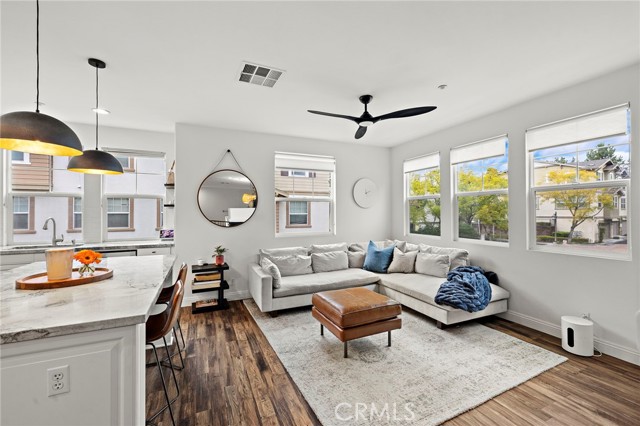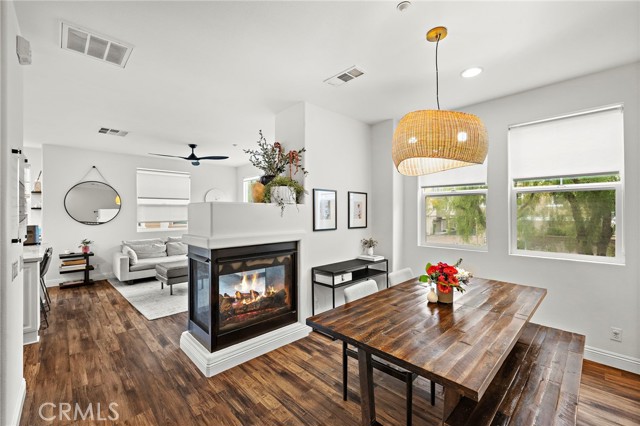 Situated on a premium corner lot with tranquil tree and hillside views, this light-filled home offers an exceptional blend of comfort, style, and location. A charming wrap-around covered porch with custom lighting and beam ceilings welcomes you and creates the perfect setting to relax and enjoy the peaceful surroundings. Inside, soaring ceilings and abundant natural light highlight a thoughtfully designed floor plan featuring formal living and dining rooms, a beautifully remodeled entertainment center, and a striking double-sided fireplace ideal for everyday living and entertaining. The fully remodeled kitchen serves as the heart of the home, showcasing a huge center island, updated counters, custom lighting, and seamless flow into the family room. LVP flooring, custom blinds, white interior paint, and upgraded hardware throughout enhance the home’s modern yet inviting feel. Upstairs offers an ideal layout with three full bedrooms including a stunning primary suite featuring tranquil views, a remodeled bath with double sinks, soaking tub, separate shower, updated lighting, and a spacious walk-in closet with custom finishes. Two generous secondary bedrooms, an updated secondary bath, and convenient upstairs laundry with additional storage complete the second level. Additional highlights include an oversized two-car attached garage with epoxy flooring, a HUGE dedicated storage room perfect for seasonal items, a tankless water heater, 240 Volt NEMA outlet, remodeled banister and staircase, and numerous thoughtful upgrades throughout. Ideally located on a single-loaded street with ample parking and added privacy, this townhome is close to schools, pools, playgrounds, and community amenities — offering the best of comfortable living in a beautiful setting.
