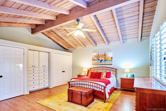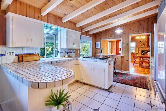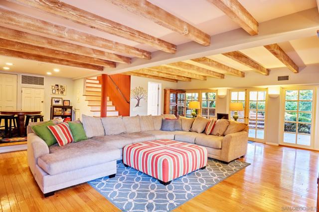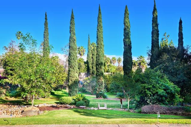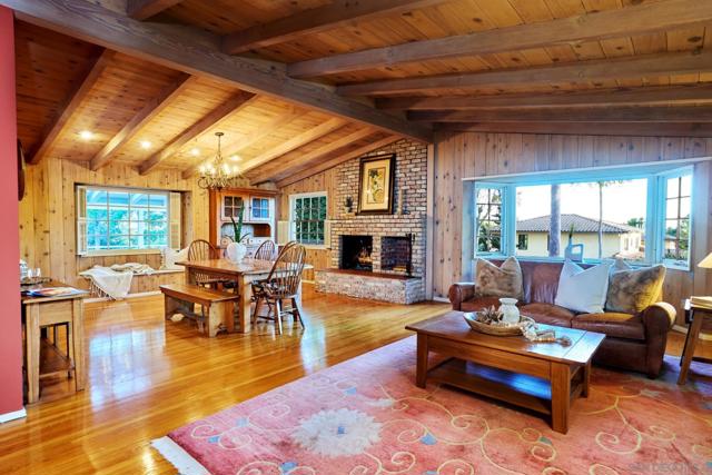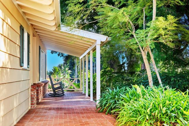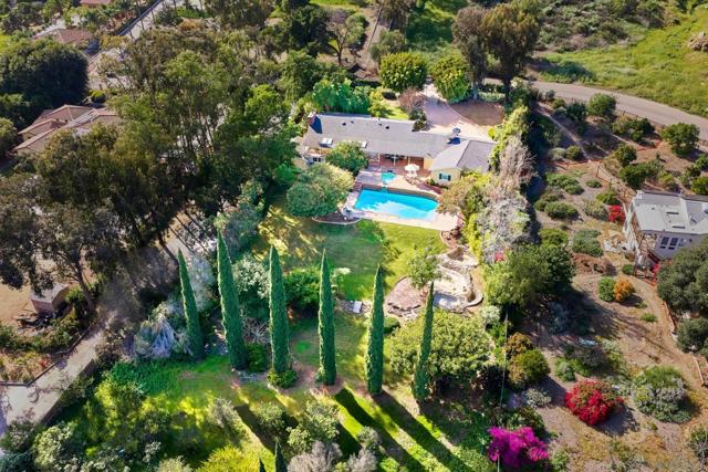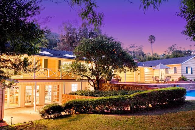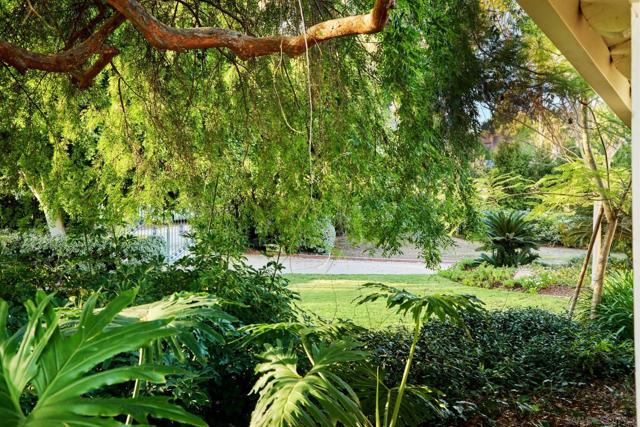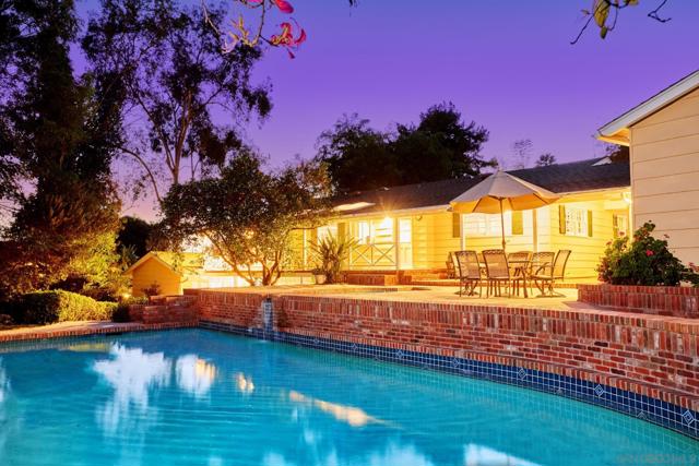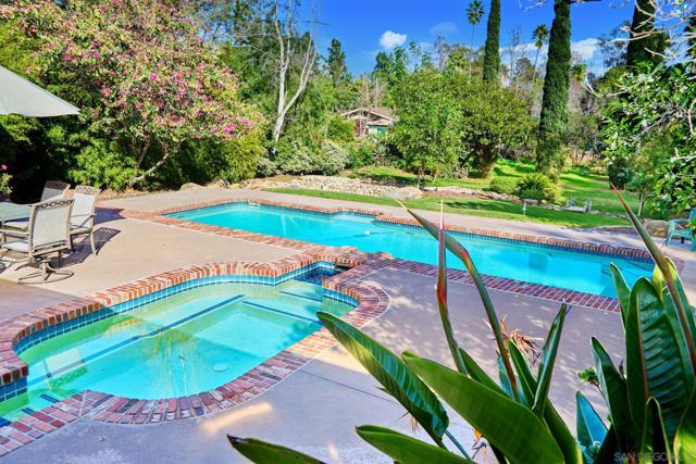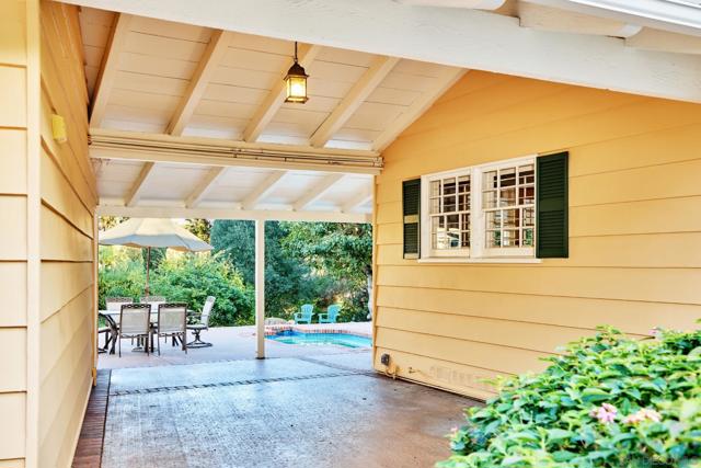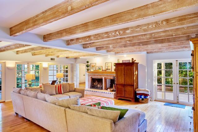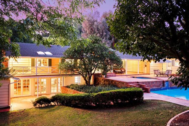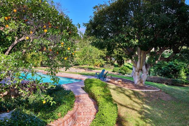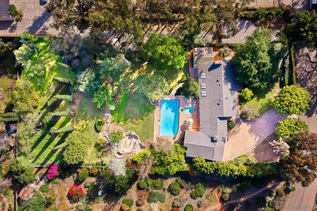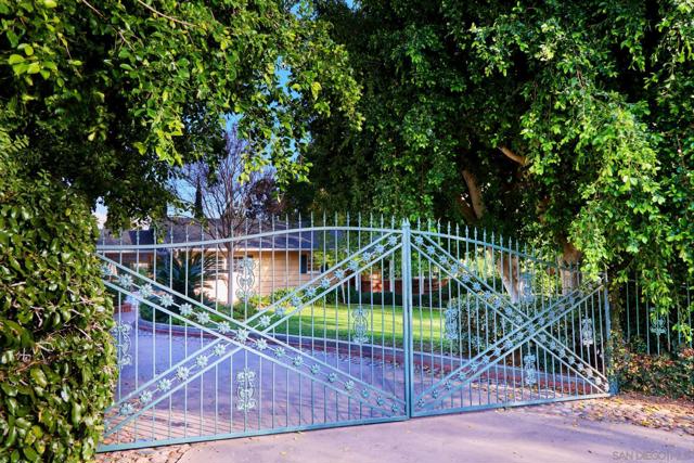 Behind verdant trees, privacy hedges & distinguished fern-green gates lies a sprawling 1950s ranch overlooking festive brick patio, swimming pool, spa & one-acre meadow of manicured lawn, flowers, citrus & towering cypress trees. Interior includes original hardwood floors in perfect condition, beamed vaulted ceilings, two hearty brick fireplaces & an abundance of natural light spilling through numerous French doors & windows. Picturesque breezeway connects the house to the 3-car garage & guest quarters.