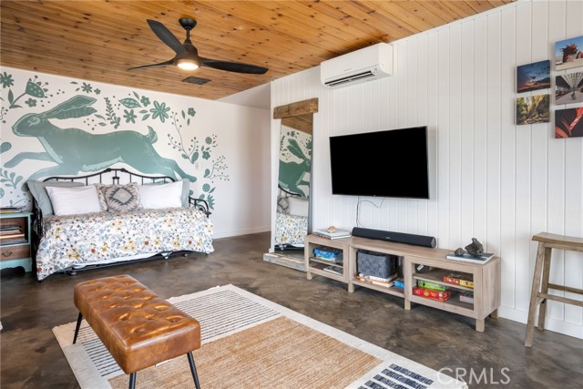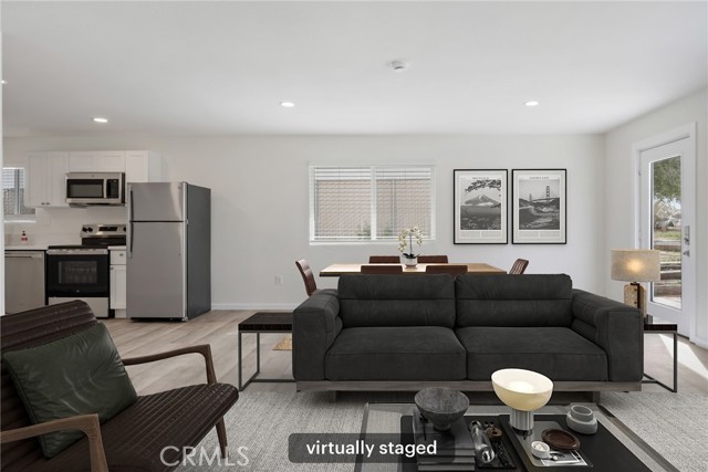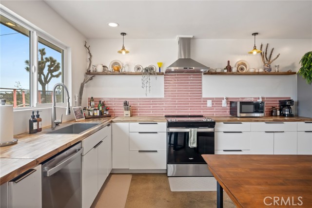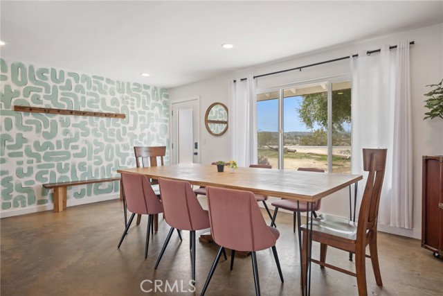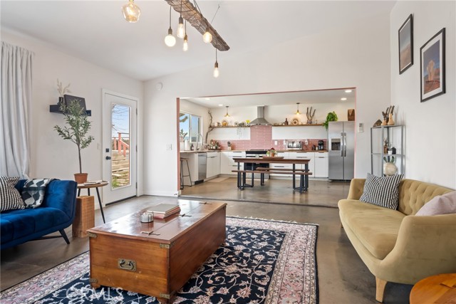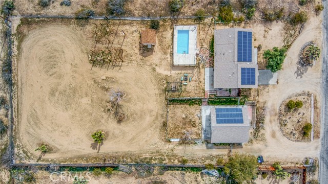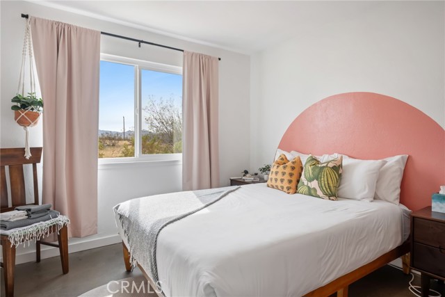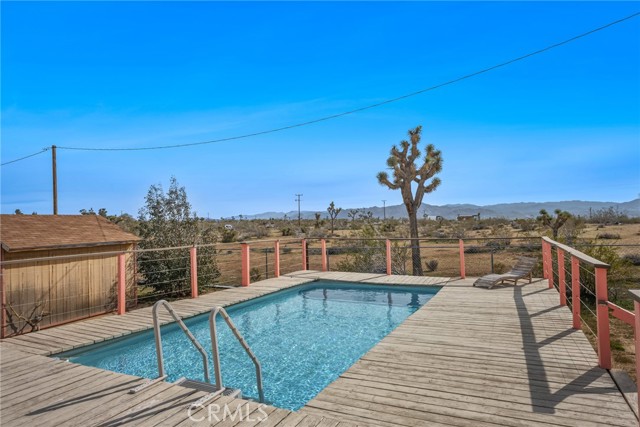 Rare opportunity to own two fully renovated homes on one expansive 1.08-acre lot, showcasing panoramic views of the Joshua Tree mountain range. This exceptional property is ideal for owner occupancy or investment, with a successfully proven short-term rental history as an Airbnb “Guest Favorite,” boasting a 4.9-star average rating and over 115 reviews. The main residence spans 2,005 sq ft and offers 4 bedrooms and 2 bathrooms, thoughtfully updated with modern finishes throughout. The newly remodeled bathrooms showcase beautiful tilework, stylish vanities, and contemporary hardware. The open-concept kitchen flows seamlessly into two distinct living areas, creating an ideal space for entertaining or relaxing. Highlights include quartz countertops, a pantry, updated recessed lighting, and newer electric appliances. The fully renovated ADU offers approximately 960 sq ft, featuring 2 bedrooms and 1 bathroom—perfect for extended family, guests, or rental income. Both units are equipped with efficient mini-split AC/heating systems for year-round comfort. Step out back to enjoy a 10-person above-ground pool, expansive deck, and spacious lot ideal for gatherings or other projects. Pull into the large circular driveway providing parking for up to 10 vehicles, with space for an RV or oversized vehicle. Additional features include solar panels for energy efficiency and a location that’s hard to beat—just 15 minutes to Joshua Tree National Park and 15 minutes to Pioneertown.