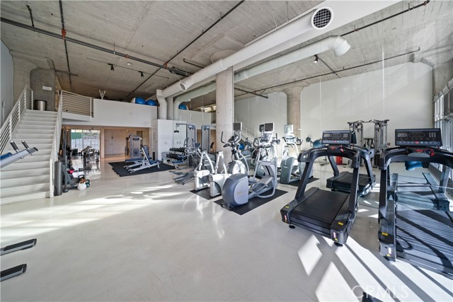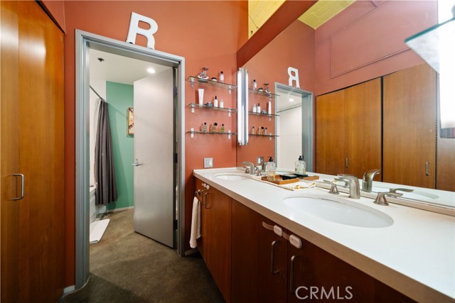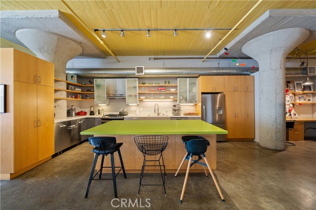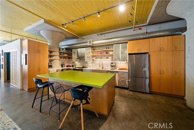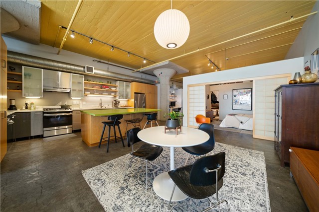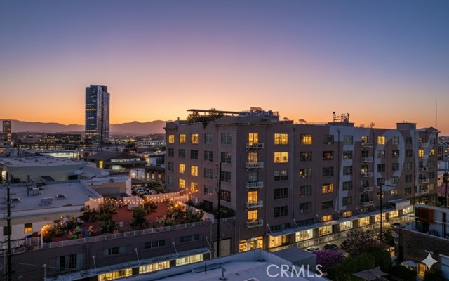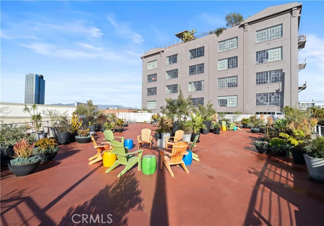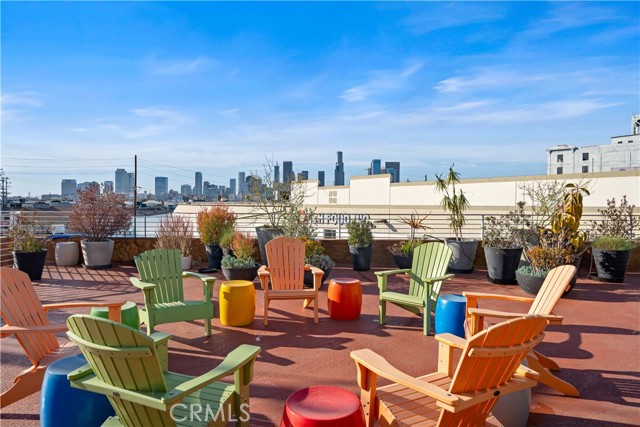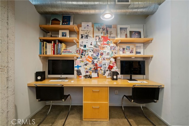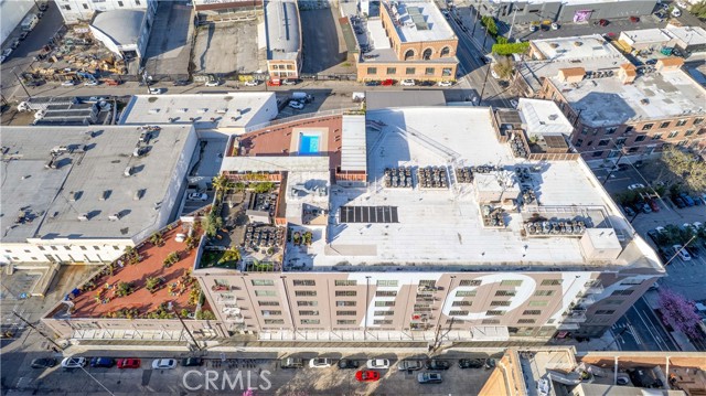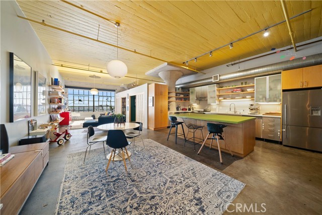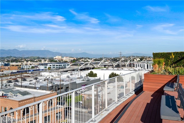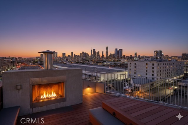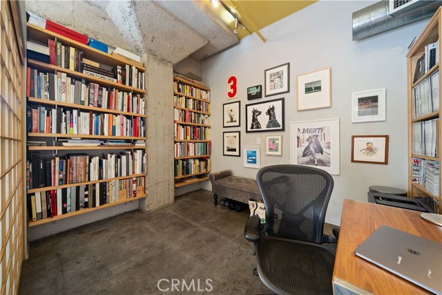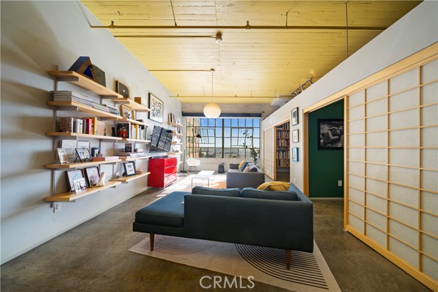 A rare offering in the historic 1924 Toy Factory, situated in the heat of LA's Art District. This striking loft pairs vintage architectural elements with sleek modern-industrial styling, delivering a perfect balance of character and comfort. Perched on the 6th floor with coveted south-facing exposure, this true live/work residence is flooded with natural light and showcases city views, dramatic 11-foot ceilings, polished concrete floors, and central HVAC. The expansive living space is anchored by a chef-inspired custom kitchen featuring quartz countertops, stainless steel appliances, smart switches and an oversized island with breakfast bar, ideal for both everyday living and elevated entertaining. A generous dining area flows into a private office with floor-to-ceiling built-in bookshelves, offering a versatile space for work, media, or creative use. A dedicated guest room provides comfort and privacy for visiting friends or family. The primary bedroom features a large walk-in closet, while the nicely sized bathroom is appointed with dual vanities, a deep soaking tub, and an integrated laundry area with washer and dryer. Additional enhancements include a custom-built wall of storage with an integrated desk, thoughtfully designed to maximize both style and function. Oversized industrial windows line the living room and are framed by custom pull-down shades, capturing sun-drenched southern light and framing sweeping urban views throughout the day. Residents of Toy Factory Lofts enjoy a professionally managed, amenity-rich community with 24-hour security and concierge service, a first-level fitness center with yoga loft and Pilates reformer, and a convenient neighborhood market just next door. The third-floor garden lounge offers BBQ areas, while the rooftop deck features a resort-style pool (currently under renovation), private cabanas, fire pit, and breathtaking 360-degree panoramic views of Downtown Los Angeles. The neighborhood is patrolled by the BID's (L.A. Downtown Industrial Business Improvement District) Public Safety Services via bike and vehicle. The unit includes one deeded subterranean parking space equipped with an electric vehicle charger. Private storage is available for an additional charge per month, with optional additional parking available on Mateo Street.