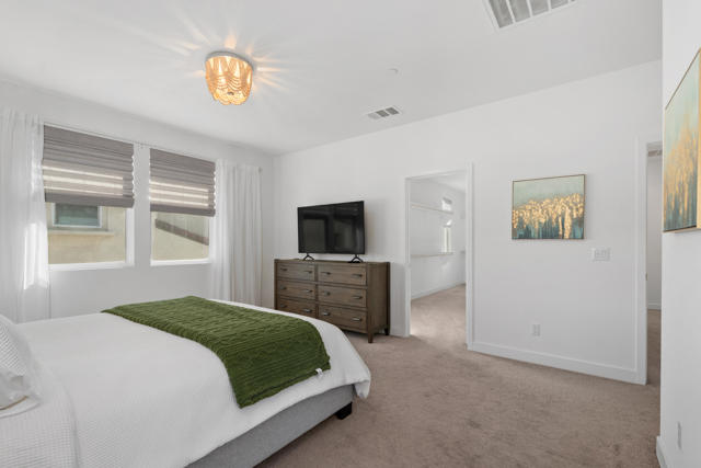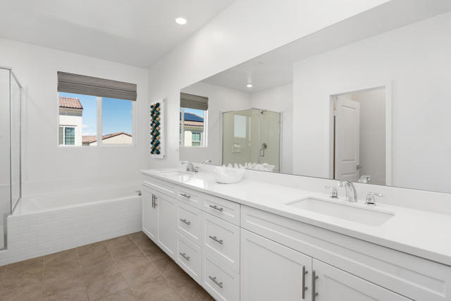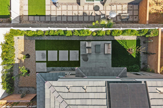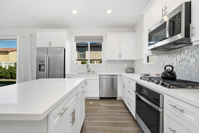 Welcome to this beautifully appointed 2022-built home located in the highly desirable University Park community of Palm Desert. Offering 1,945 square feet of thoughtfully designed living space, this 4-bedroom, 3-bath residence blends contemporary style, comfort, and efficiency--perfect for a full-time residence or a luxurious desert retreat. Step inside to an open-concept floor plan filled with natural light, enhanced by double-pane windows and sliding doors. Wood-like tile flooring flows seamlessly through the main living areas, while plush carpet adds warmth to each bedroom. The heart of the home is the stunning kitchen, featuring quartz countertops, white contemporary cabinetry, a custom backsplash, stainless steel appliances, a gas cooktop, a pantry, recessed lighting, and sleek modern fixtures. The kitchen opens effortlessly to a spacious dining area and inviting living room--ideal for entertaining or relaxing with family and friends. The generous primary suite offers a true retreat, complete with a large walk-in closet, dual vanities, a soaking tub, and a separate shower. All bedrooms are spacious and well-appointed, and each bathroom showcases quartz counters and contemporary cabinetry. Custom window coverings throughout the home add both style and privacy. An individual laundry room and attached two-car garage provide everyday convenience. Designed with efficiency in mind, the home includes paid-off solar panels and a Lennox AC system for optimal comfort and energy savings. The private backyard has been professionally landscaped and updated with a concrete slab patio, walkways, and low-maintenance turf--creating the perfect outdoor setting for relaxing or entertaining under the desert sky. Residents of University Park enjoy resort-style amenities including a sparkling pool and spa, beautifully maintained parks with playgrounds, and a dog park. Ideally located near shopping, dining, and everything Palm Desert has to offer, this home delivers the perfect balance of style, location, and lifestyle. Whether you're seeking a vacation getaway or a year-round desert residence, this home is move-in ready and comes furnished--bring your suitcase and start enjoying the best of Palm Desert living.