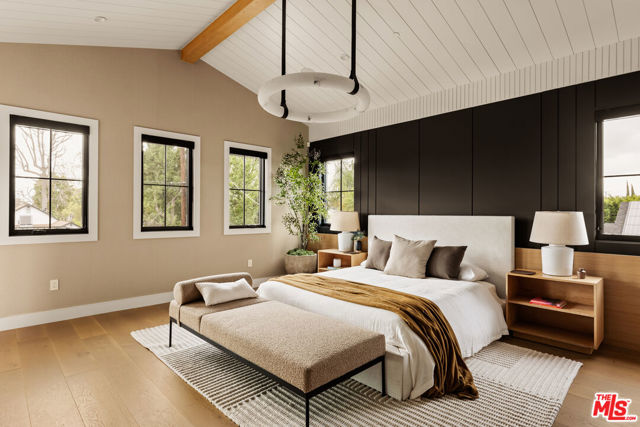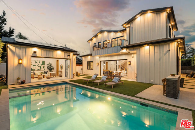 Tucked behind gates on a generous corner lot in one of Sherman Oaks' most desirable pockets, this 6-bedroom, 6.5-bath Modern Cape Cod spans 4,190 square feet and features ample amenities, including an ADU, pool, multiple fireplaces, and elegant entertaining spaces, indoors and out. Fresh and inviting, the home warmly greets guests with a paver-style driveway, lawn, and a two-car garage, with tall hedges providing privacy. Inside, extra-high ceilings, wide-plank oak floors, and abundant natural light create a bright, airy flow throughout. The interiors are anchored by three fireplaces in the living room, family room, and primary suite - quite lovely. The heart of the home, open kitchen and living spaces include high-end appliances, seamless indoor-outdoor flow, and refined finishes that feel current yet timeless. An ADU allows for a true live-work lifestyle, guest quarters, or multigenerational living, while smart home technology and solar panels prioritize convenience and sustainability. Outside, multiple lounge areas invite relaxed gatherings, a sunset deck primary patio space, entertain around the firepit, and under the stars for al fresco dining, or pool and spa side. Mature landscaping and treetop views add to the sense of seclusion, creating a private retreat just moments from Ventura Boulevard.