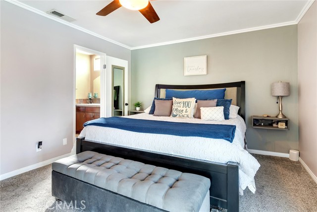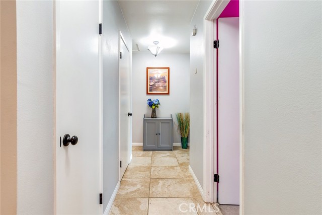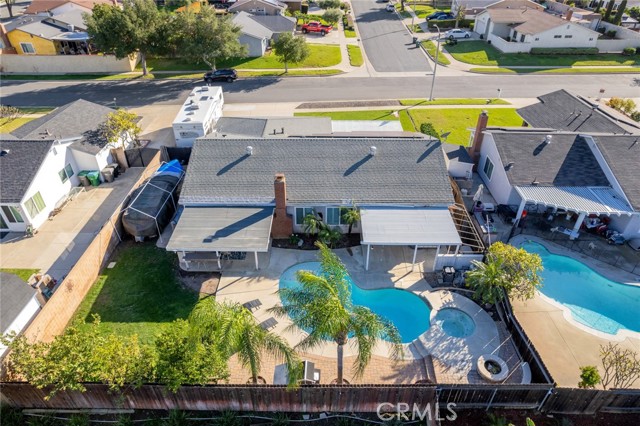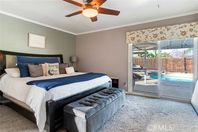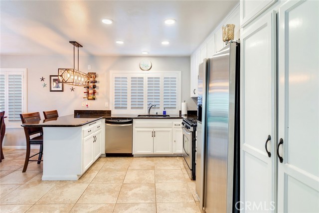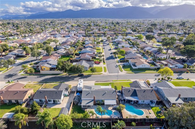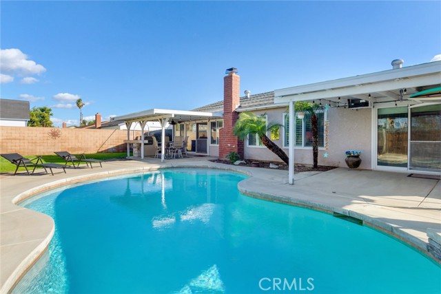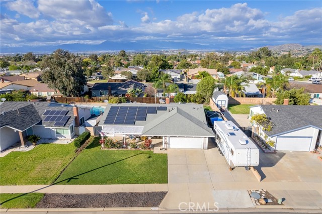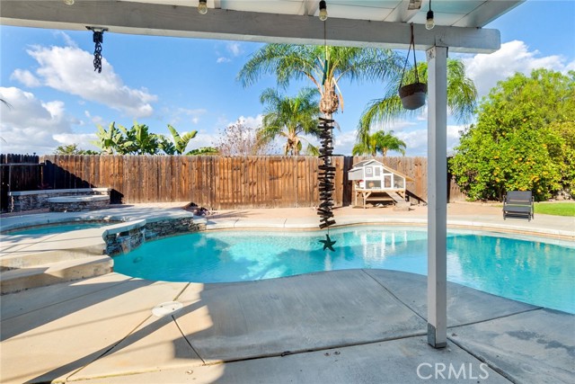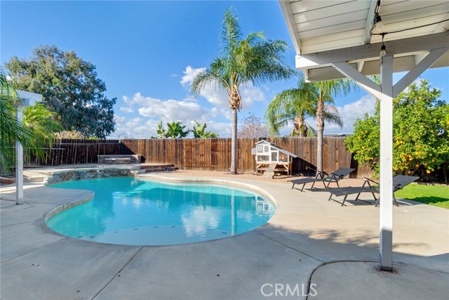 Beautiful single-story 4-bedroom, 1 3/4 bath home offering 1615 sq ft of comfortable living space. The upgraded kitchen features granite countertops, updated cabinetry, stainless steel appliances, and travertine flooring that flows through the family room, kitchen, and hallway. Primary bedrooms offers newer carpet and the home is enhanced with dual-pane vinyl windows, plantation shutters, recessed lighting, and ceiling fans throughout. The spacious primary bedroom includes a sliding glass door leading to the backyard. One secondary bedroom features elegant double-door entry - perfect for home office or guest room. Step outside to your private backyard retreat complete with a pool and spa, two patio covers, a fire pit, and mature fruit trees. The pool features an app-controlled system for convenient operation right from your phone. Additional highlights include RV parking and solar for energy efficiency. Ideally located near shopping and convenient freeway access - this home offers the perfect blend of comfort , upgrades and lifestyle.