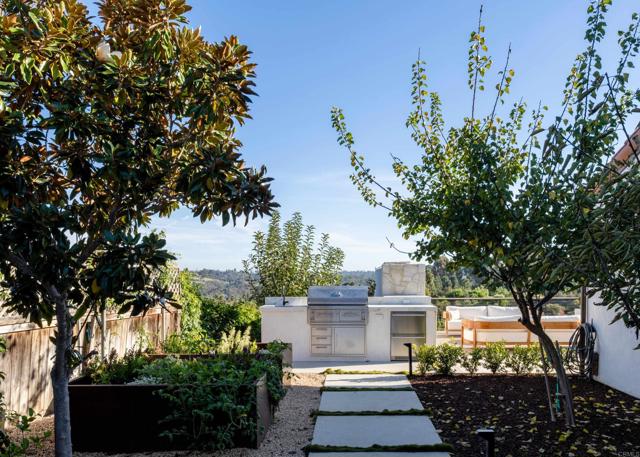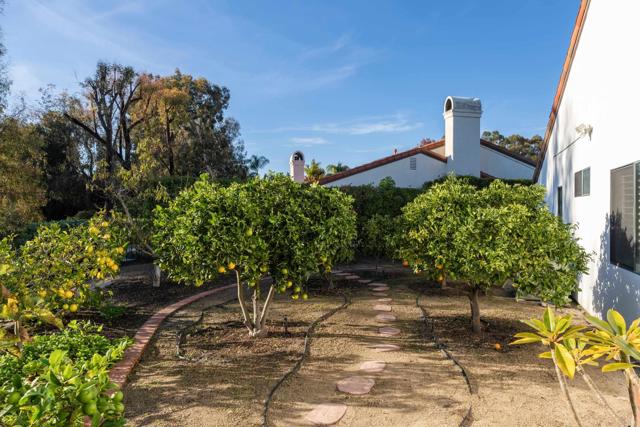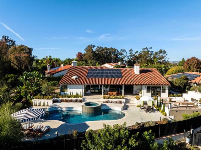 This cherished single-story Olivenhain home is more than a residence—it’s a place where memories were made and a neighborhood where people reside with permanency. Set on nearly ½ acre of beautifully landscaped grounds, the property captures sweeping 180-degree southernly valley views of Olivenhain Rancho Santa Fe, mountains, trees and city lights offering a serene private retreat just steps from top-rated schools and scenic recreational trails. Meticulously cared for and thoughtfully updated both recently and over time, the home features owned SOLAR, a light-filled living room w/ oversized sliding glass doors that open to a covered veranda, seamlessly blending indoor and outdoor living. The remodeled kitchen showcases Carrara marble countertops, custom cabinetry, SubZero refrigerator, commercial-style stove and modern appliances, perfect for both everyday living and entertaining. The kitchen offers a great-room feel open to the family room with soaring ceilings, built-in speakers, dry bar with two refrigerator drawers and quartz countertops, and convenient access to the outdoor kitchen. Executive office with wood cabinetry and built-ins +outdoor access. The backyard and east side yard with hardscape and landscape plus outdoor lighting (completed Summer of 2025) is a private oasis, entirely fenced with a deck, outdoor fireplace, built-in BBQ area with sink, fridge and built-in beverage chest, sparkling saltwater pool & spa, outdoor shower, storage room, and an impressive collection of mature fruit trees, including Meyer lemon, fig, olive, orange, grapefruit, cherry, apricot, avocado, banana and apple. Enjoy quiet spaces designed for reflection, as you take in the enormous view. No HOA fees is a plus! Located at an ideal hilltop location on a cul-de-sac. ~ POTENTIAL to be a 5-bedroom + office as the 5th bedroom was converted into an extension of the primary suite's closet. ~ Gardener's delight with corten steel planter boxes for growing your own produce or seasonal blooms ~ Inviting Mediterranean-style courtyard with newly installed fountain ~ Custom iron front doors that offer privacy and security while still enjoying the western breezes ~ Fenced property ideal for pets Only minutes away to Olivenhain Pioneer School, Diegueno Middle School and La Costa Canyon High School.
