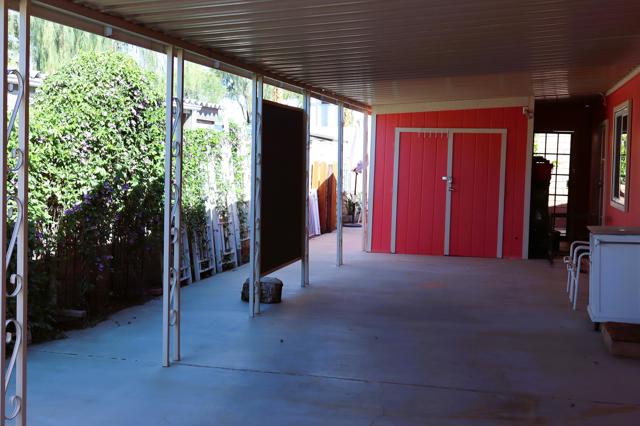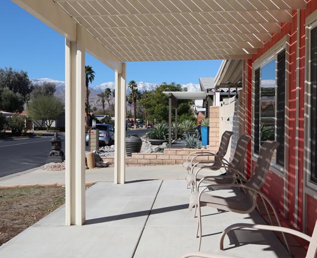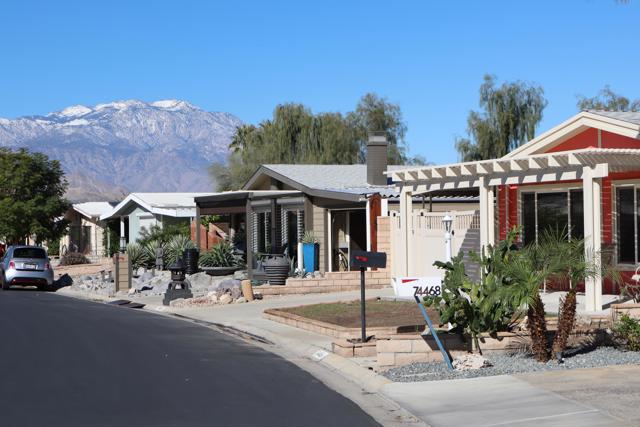 Welcome to your Desert Oasis home in the heart of Palm Desert & beautiful Portola Country Club where you Own your land. Overlooking the lush park greenbelt with great views of the Santa Rosa mountains, you will love sitting on the covered front veranda having your morning coffee. One of 3 pools, a Doggie Park,pickleball & bocce are also just across the street. An l8-hole Accredited Par-3 Golf course is a star feature of Portola & is included for the owners in the low monthly HOA fee of $455. Newly painted in a fresh tropical coral hue, the home has dual-pane windows for energy efficiency & lots of natural light. Plantation shutters are another bonus, along with drywall construction beautiful laminate flooring. High vaulted ceilings as you enter add a nice open feeling along with the wonderful views coming thru the windows. The inviting kitchen is situated off of the separate family room for ease of entertaining. The FR has dual-pane sliding doors that lead directly onto the side covered patio (great for Alfresco dining) The kitchen has bright recessed lighting, breakfast island & a gas cooktop with white tile backsplash with horizontal ship-lap ceiling border. Cooks will appreciate the large convenient pantry where everything is close at hand. The primary suite is well-sized with walk-in-closet & a huge ensuite bathroom with a separate soaking tub & shower & a double sink vanity. The second bathroom is located across from the guest bedroom. It features a great ''Aging in Place'' walk-in shower with grab bars & beautiful ''Rain-glass'' doors. The large laundry has a built-in desk/computer station and a door leading out to the covered carport & storage shed. The home is surrounded on 3 sides with a perimeter wall offering both privacy & a play area for any canine pals. Beautiful flowering vines & plants & even an extra area for a home garden. PCC is a 55+community with a hometown feel of only 500 homes. Enjoy the newly remodeled clubhouse & many social activities in your new Desert lifestyle. Located near El Paseo & its shops & restaurants,expansive Palm Desert Park with Aquatic Center, dog parks & beautiful walking trails. Eisenhower Hospital & great medical facilities are close by. Come & see why Portola Country Club is ''The'' choice for those looking for the perfect 55+Active Living experience.