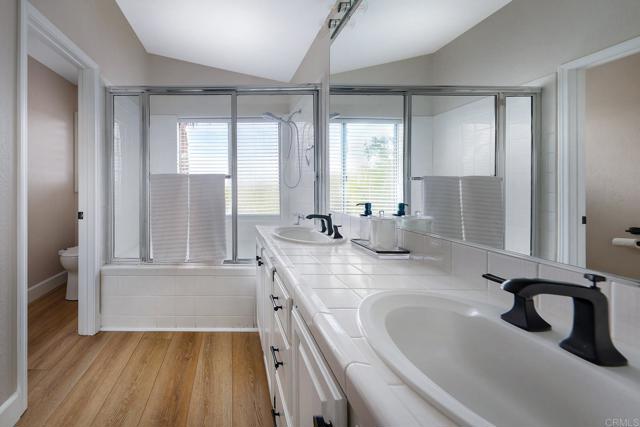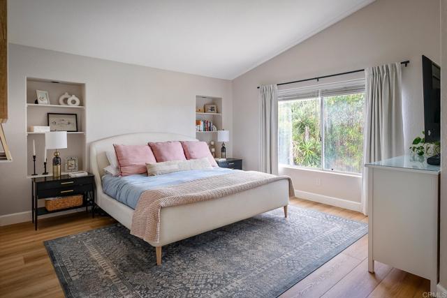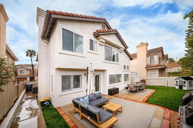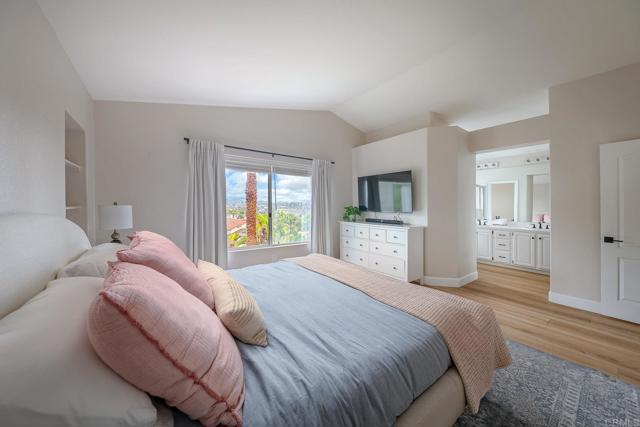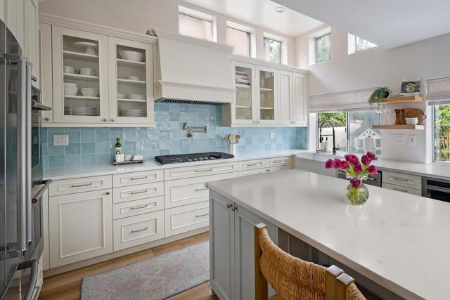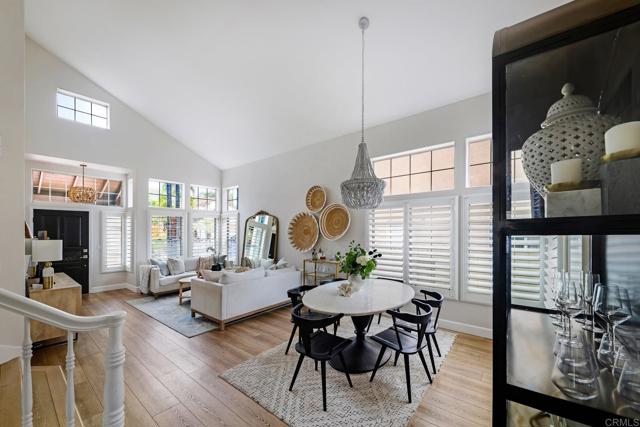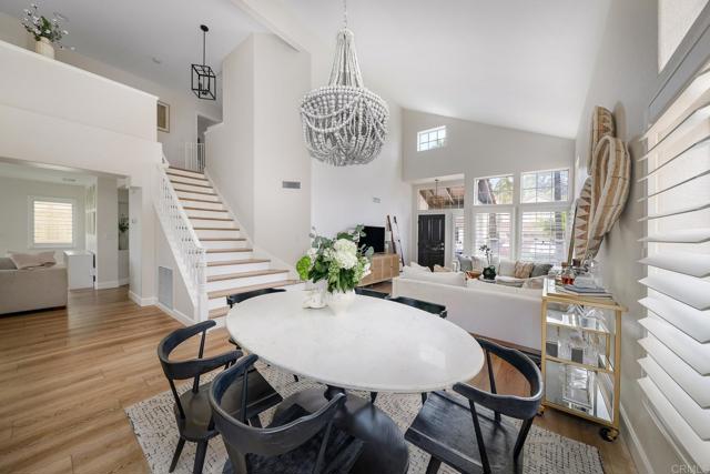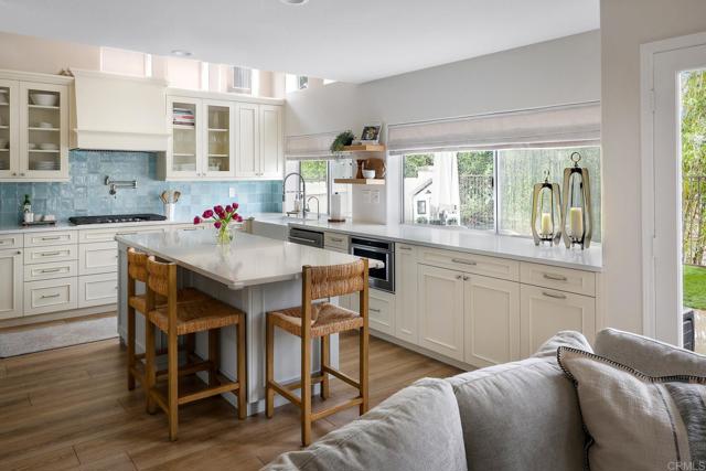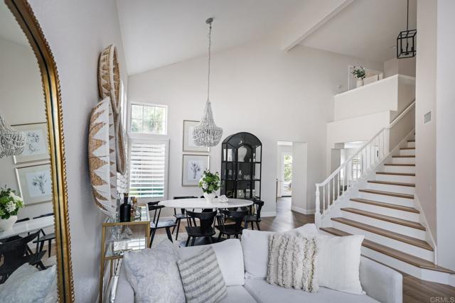 Highly sought-after Alga Hills home in Carlsbad, beautifully positioned on a premium elevated lot with sweeping La Costa Valley views from the primary suite. This two-story residence offers 1,990 sq ft of open-concept living with 3 bedrooms and 2 full baths upstairs, plus a downstairs powder room, and features over $180,000 in renovations completed since 2021. The formal living and dining areas welcome you with soaring ceilings and abundant natural light. The fully remodeled chef’s kitchen includes custom cabinetry, an oversized island with seating and built-in storage, quartz countertops, farmhouse sink, double ovens, built-in microwave, pot filler, and wine refrigerator. The adjoining family room features a beautifully updated custom-tile fireplace, creating open-concept living. Luxury vinyl plank flooring extends throughout the home, complemented by a full interior repaint, refreshed lighting and electrical, plantation shutters, and remodeled bathrooms with modern fixtures and finishes. A new A/C unit was installed in 2022. Exterior improvements include fresh paint, low-maintenance turf in the backyard, and more. Community amenities include two pools and parks, with convenient access to beaches, shopping, dining, and award-area schools including La Costa Meadows Elementary School, San Elijo Middle School, and San Marcos High School.