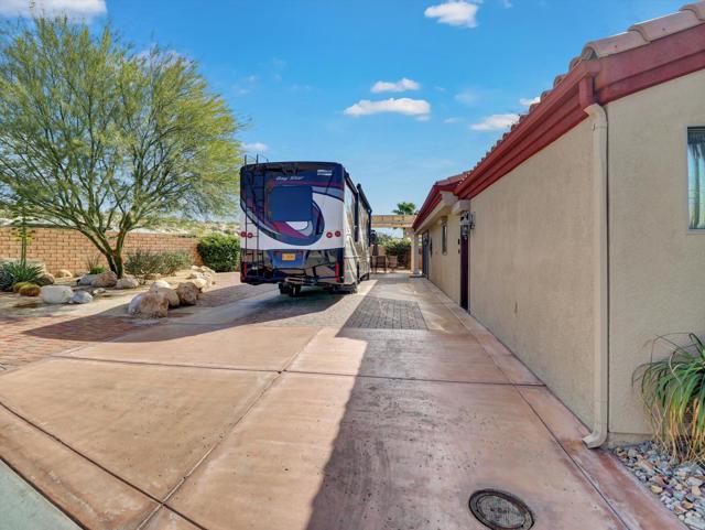 Welcome to your private desert retreat in The Vineyards Luxury Motorcoach Resort. This upgraded Plan 3 Casita is located on one of the largest and most private end-lot corner parcels in the community.Ideal solar exposure provides afternoon patio shade, perfect for relaxing outdoors. The spacious aluminum pergola and tranquil water feature create an inviting outdoor living area enhanced by soft solar lighting in the evenings.Offered fully furnished and turnkey, this casita includes an adjustable king-size bed, quality furnishings, appliances, and patio furniture, ready for immediate enjoyment.Additional features include roll-up metal doors for added security and energy efficiency, upgraded vinyl sliding doors for natural ventilation, granite countertops, tile flooring throughout, a beautifully finished shower, and a fully outfitted garage thoughtfully divided into storage and studio space, featuring built-in cabinetry, drawers, and finished flooring for flexible living options.This is more than a casita, it's an effortless desert lifestyle, ready and waiting. For Class A motorcoach owners seeking a comfortable, fully equipped home base to return to between adventures, this exceptional property offers the perfect blend of luxury, privacy, and convenience.