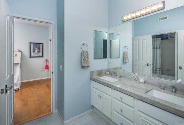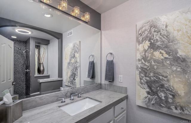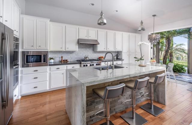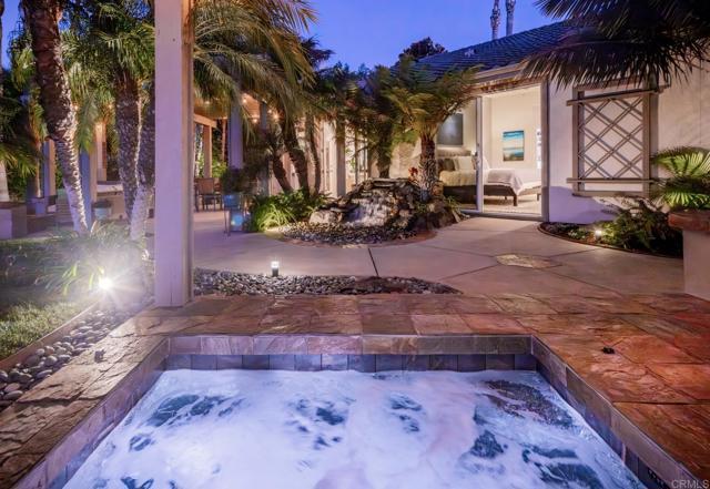 Pride of ownership radiates throughout this elegant, light and bright single-story residence, showcasing 4 spacious bedrooms, 3 full baths, and a finished 3-car garage, tucked away on a peaceful cul-de-sac in La Costa’s highly sought after Santa Fe Trails community, next to coveted Olivenhain. Designed with effortless sophistication, this home balances refined living with casual comfort, offering seamless indoor-outdoor flow, captivating sunset vistas, and a gourmet kitchen appointed with designer upgrades and curated finishes. A gracious front deck patio, framed by lush tropical landscaping and timeless archways, creates an inviting first impression. Inside, the formal living room is anchored by a custom fireplace, while the dining room, complete with bespoke cabinetry and serving space, sets the stage for memorable gatherings. At the heart of the home, the chef’s kitchen impresses with striking Brazilian stone countertops, a waterfall island, and an open connection to the outdoors, blending culinary artistry with California living. The primary suite is privately positioned to maximize serene backyard and canyon views. Its spa-inspired bath offers a daily retreat with dual vanities, a makeup vanity, jetted soaking tub, walk-in shower, and custom California Closets. Two secondary bedrooms are joined by a Jack and Jill bath with a dual-sink vanity, while a fourth bedroom - currently styled as a home office—sits adjacent to a third full bath, allowing for versatile living arrangements for family, guests, or a dedicated workspace. The backyard oasis is designed for both grand entertaining and tranquil relaxation. Enjoy an outdoor kitchen, fire pit, PebbleTec spa, and cascading waterfall—all set against the protected Encinitas Creek canyon, where panoramic sunsets and natural beauty create a rare sense of sanctuary. Additional features elevate the home’s appeal: central air conditioning, a whole-house fan, comprehensive water filtration with reverse osmosis, multi-zone surround sound with indoor and outdoor speakers, custom glass doors, fenced dog run, and designer details at every turn. The fully finished 3-car garage impresses equally, with epoxy floors, insulated doors, and custom cabinetry for style and function. Perfectly positioned for convenience, this residence is within walking distance to a charming neighborhood park and moments from award-winning schools including Olivenhain Pioneer Elementary, Diegueno Middle, and La Costa Canyon High. Just minutes away are upscale shopping, dining, golf courses, hiking trails, and the pristine beaches that make San Diego living so desirable.