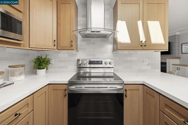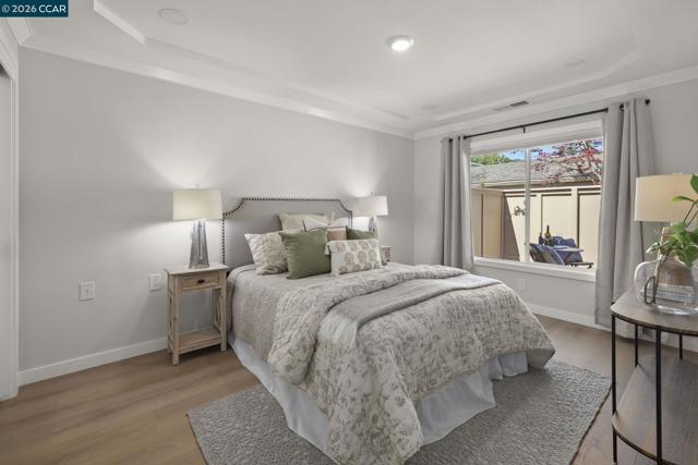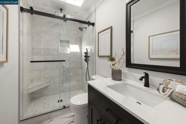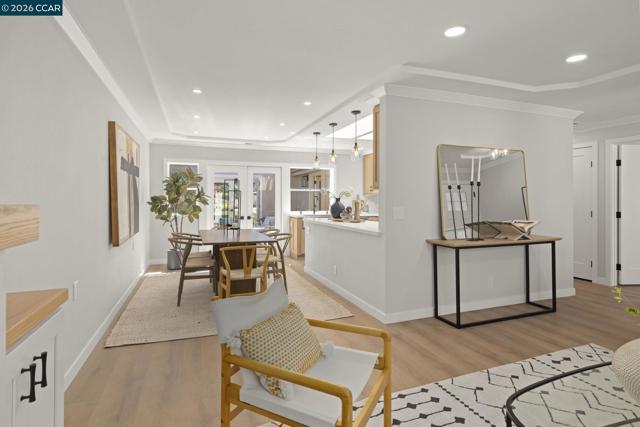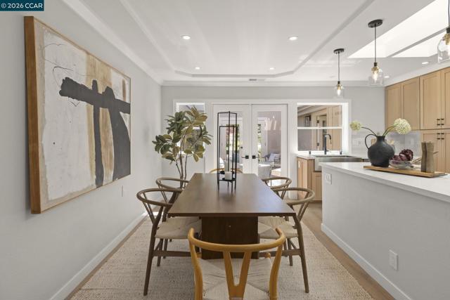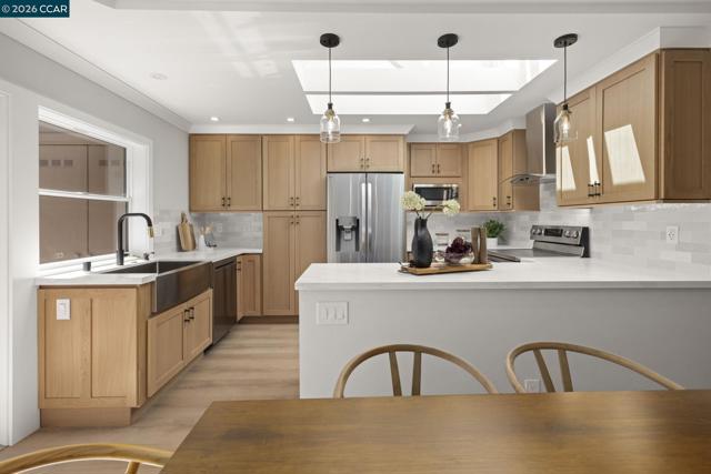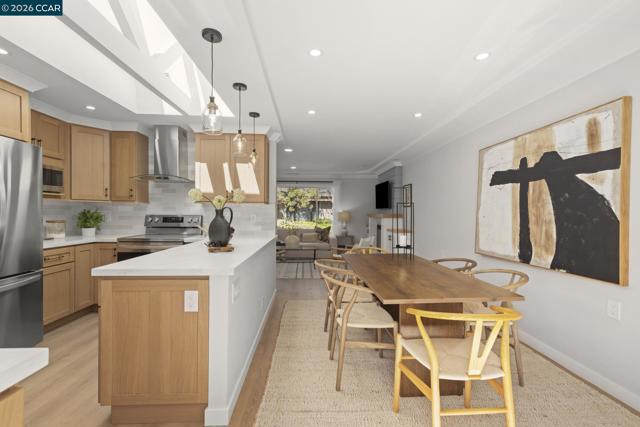 Gallo and Associates presents this beautifully redesigned and remodeled home with high-end finishes and abundant natural light. The custom kitchen features an expansive skylight, American white oak shaker cabinetry, quartz countertops, and new LG stainless steel appliances, including a wine refrigerator. The living room offers a large electric fireplace with custom shiplap surround, solid oak mantel, built-in cabinetry, and TV/HDMI hookups. The expanded primary suite includes a spa-inspired bath with custom marble shower, dual showerheads, skylight, and mirrored closet doors. The guest bedroom features a large reach-in closet, while the updated guest bath offers a marble tub surround, skylight, and additional storage. Additional highlights include recessed LED lighting, coved ceilings, bedrooms prewired for ceiling fans, a laundry closet with GE laundry center, new double-pane windows and French doors, central HVAC with new ductwork, USB-equipped outlets, and a new electrical subpanel. Enjoy a private rear brick courtyard with French doors and a separate entry garden with tile and custom steel gate. All work permitted by Rossmoor MOD and the City of Walnut Creek.